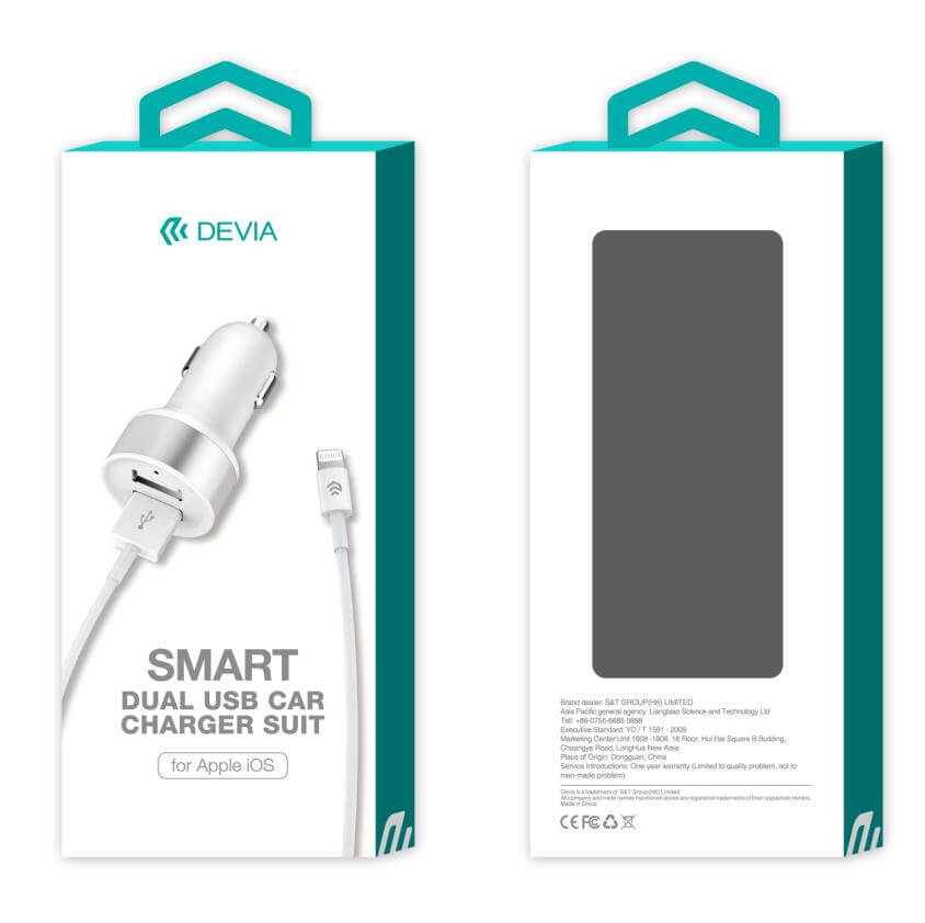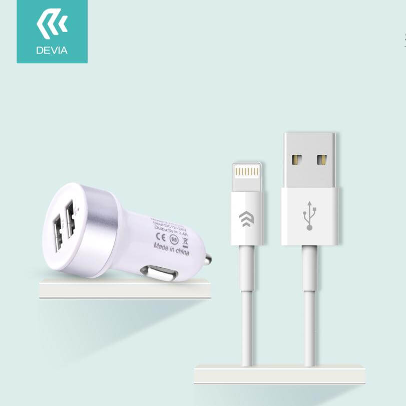 Devia Dual USB Smart Charger Lightning Suit - зарядно за кола с 2xUSB изхода и Lightning кабел за iPhone, iPad и iPod (бял)