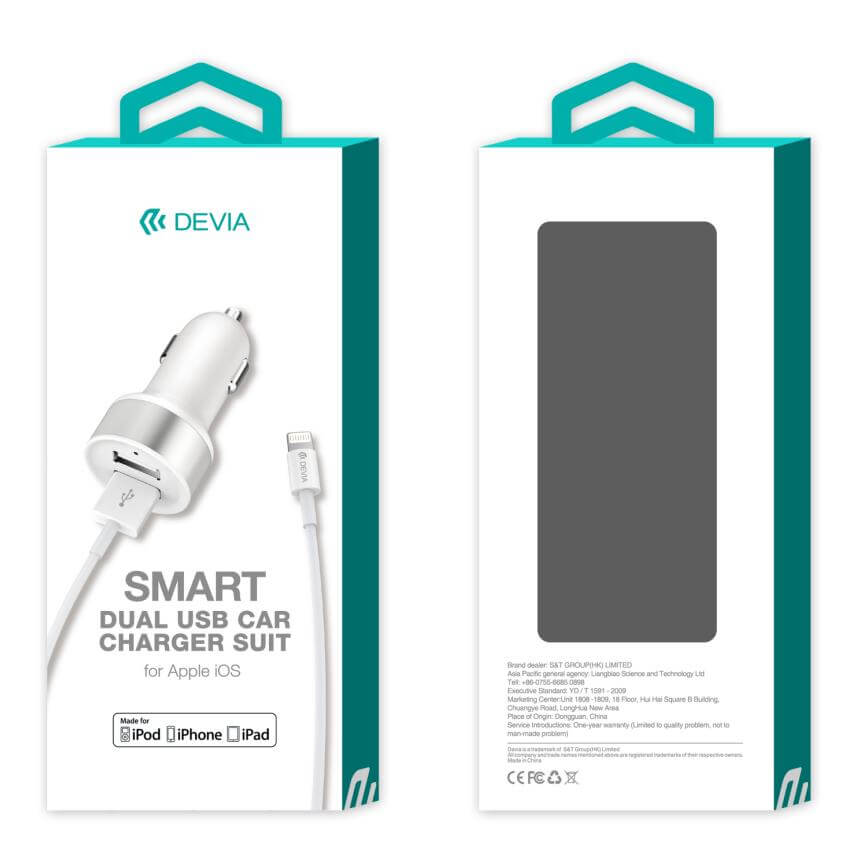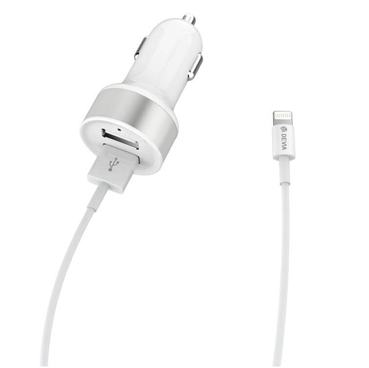 Devia Dual USB Smart Charger MFI Lightning Suit - зарядно за кола с 2xUSB изхода и Lightning кабел за iPhone, iPad и iPod (бял)