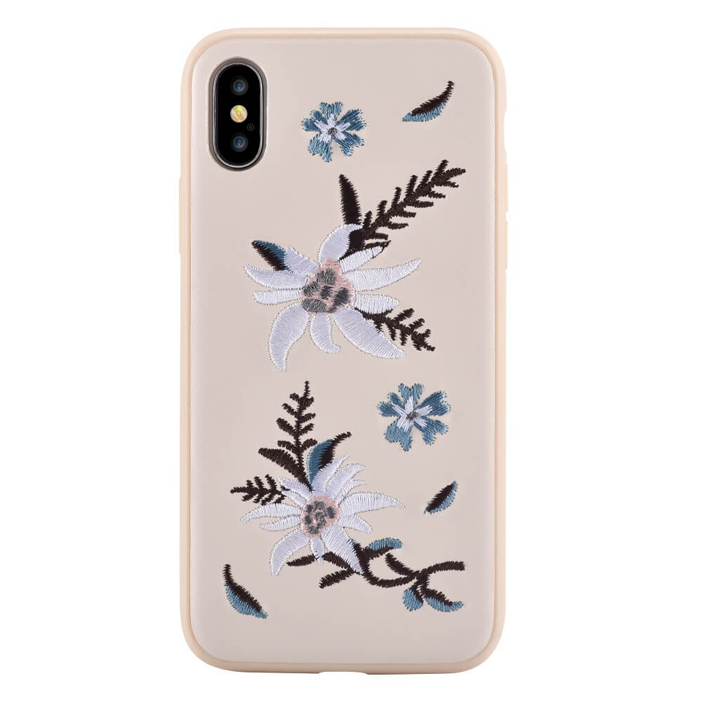 Devia Flower Embroidery Jalam Case - дизайнерски кожен кейс с ръчна бродерия за iPhone XS, iPhone X (бежов)