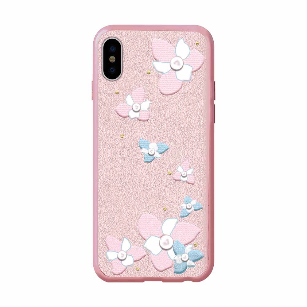 Devia Flower Embroidery Lanya Case - дизайнерски кожен кейс с ръчна бродерия за iPhone XS, iPhone X (розов)