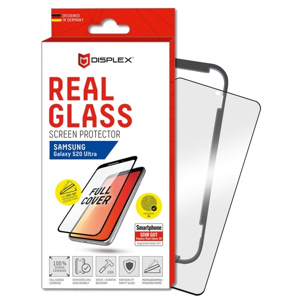 Displex Real Glass 10H Protector 3D Full Cover FPS - калено стъклено защитно покритие с поддръжка на сензора за отпечатъци за дисплея на Samsung Galaxy S20 Ultra (черен-прозрачен)
