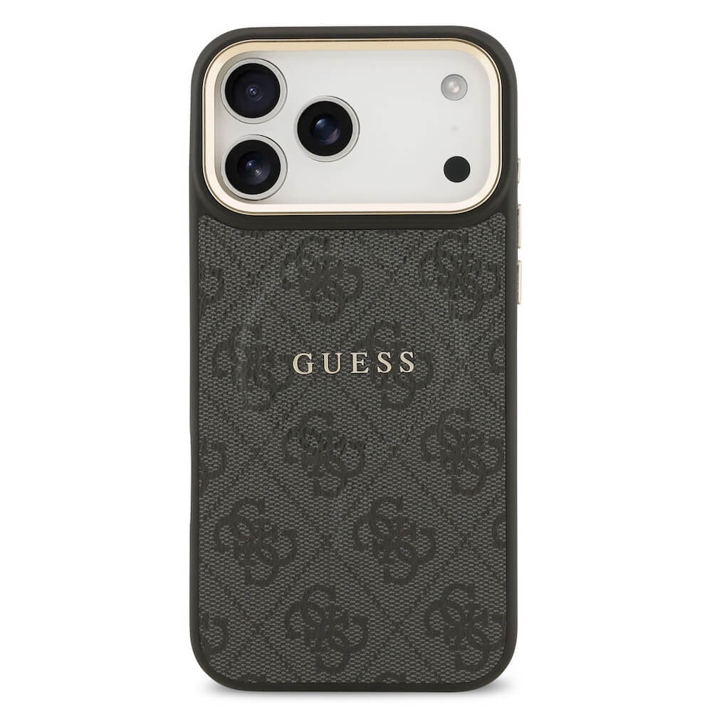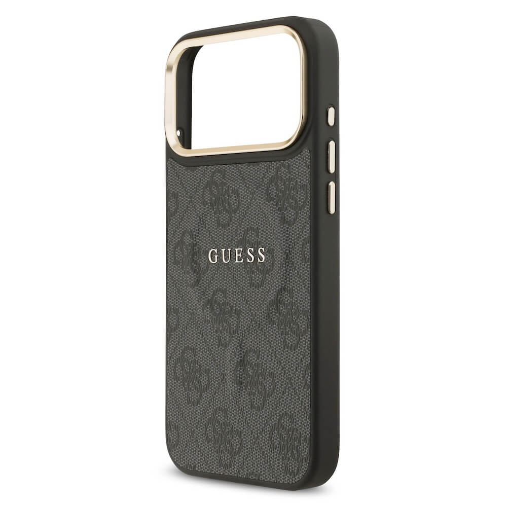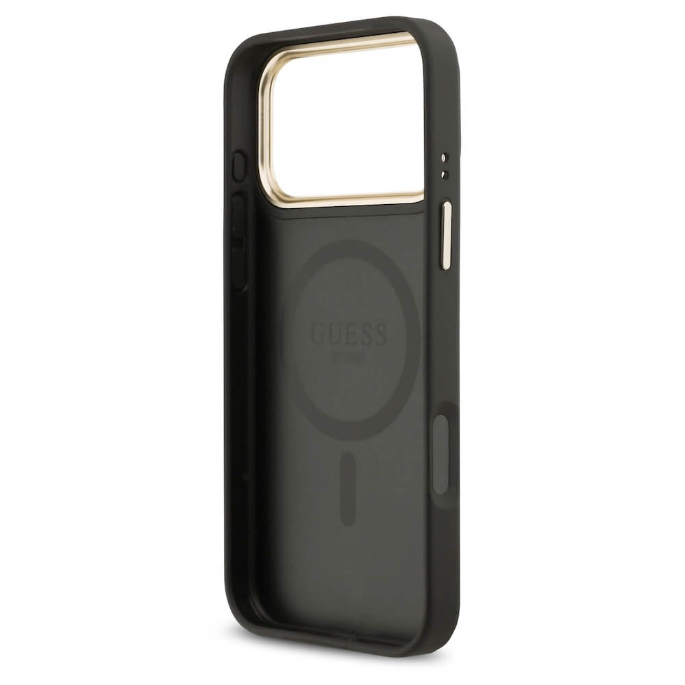 Дизайнерски кожен кейс с MagSafe за iPhone 17 Pro Max - Guess PU 4G Gold Frame MagSafe Leather Hard Case (черен)