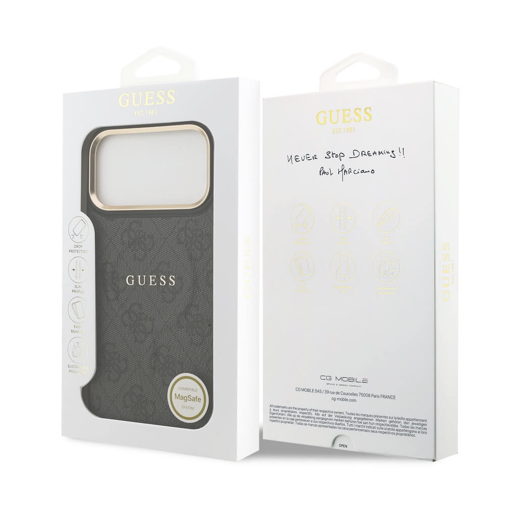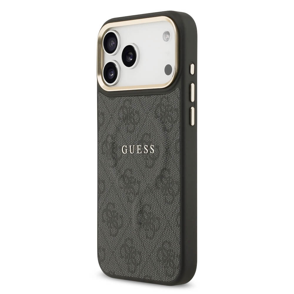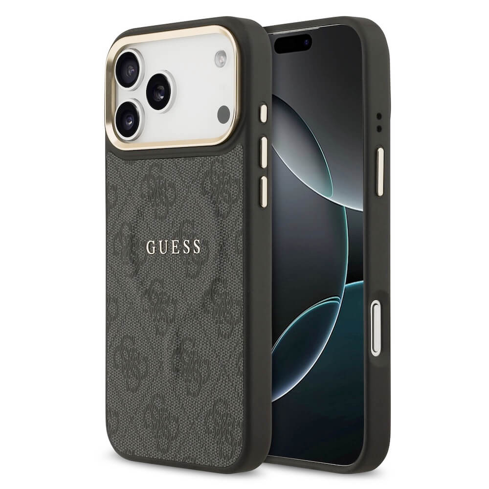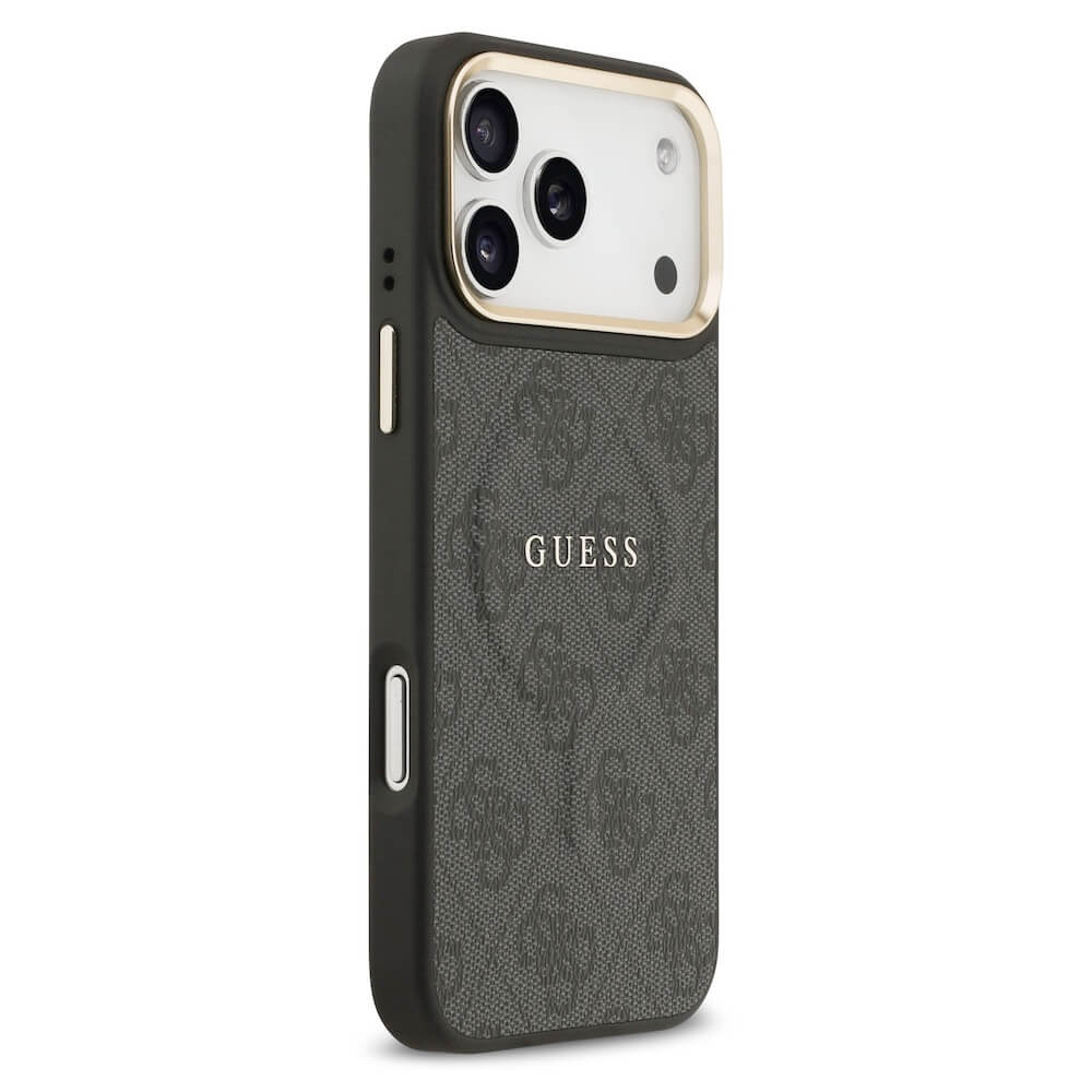 Дизайнерски кожен кейс с MagSafe за iPhone 17 Pro Max - Guess PU 4G Gold Frame MagSafe Leather Hard Case (черен)