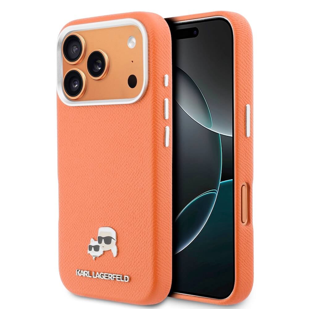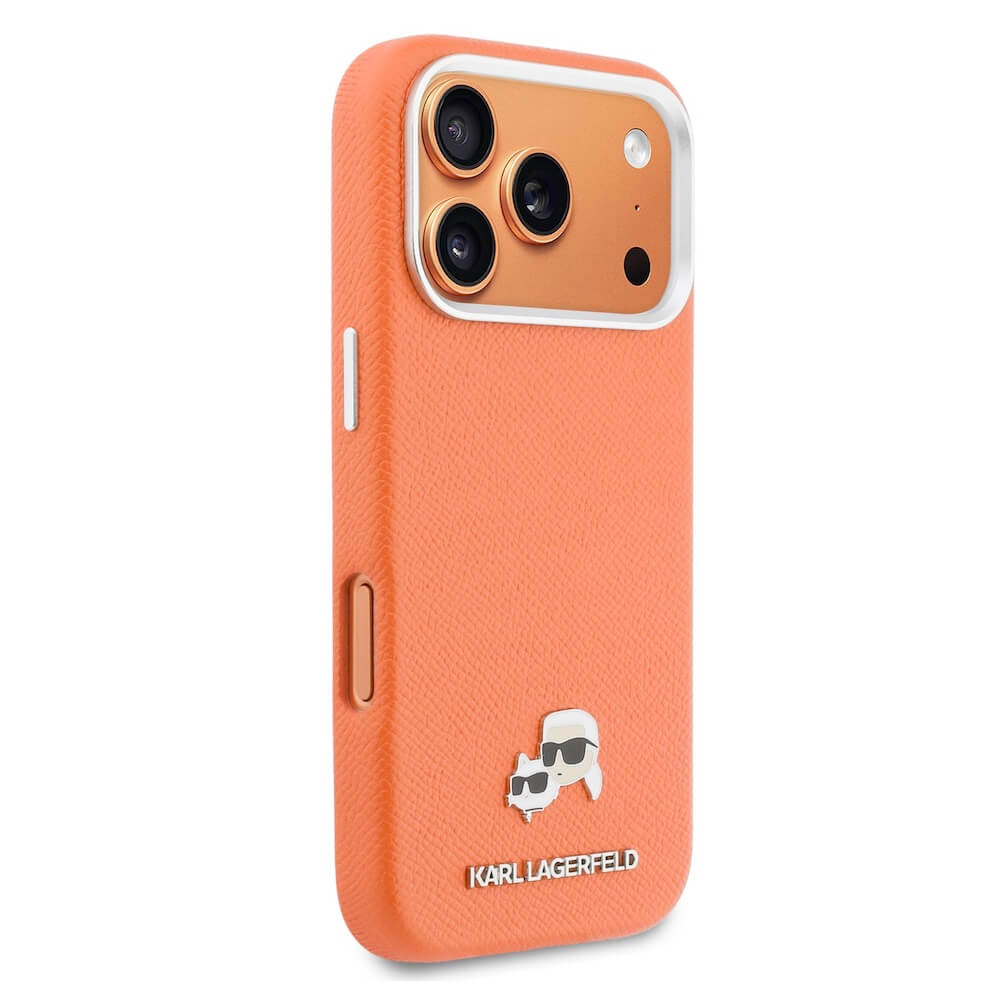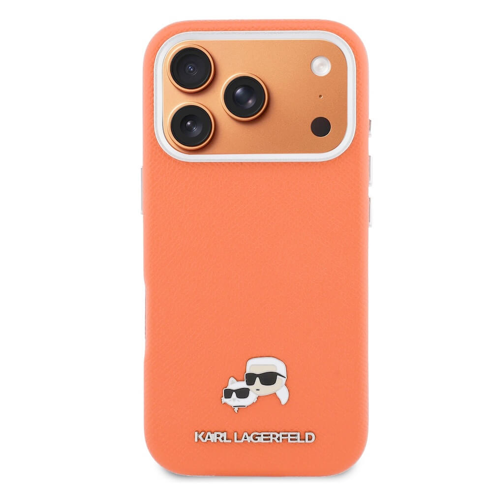 Дизайнерски кожен кейс с MagSafe за iPhone 17 Pro Max - Karl Lagerfeld PU Saffiano Karl and Choupette Heads Pins MagSafe Case (оранжев)