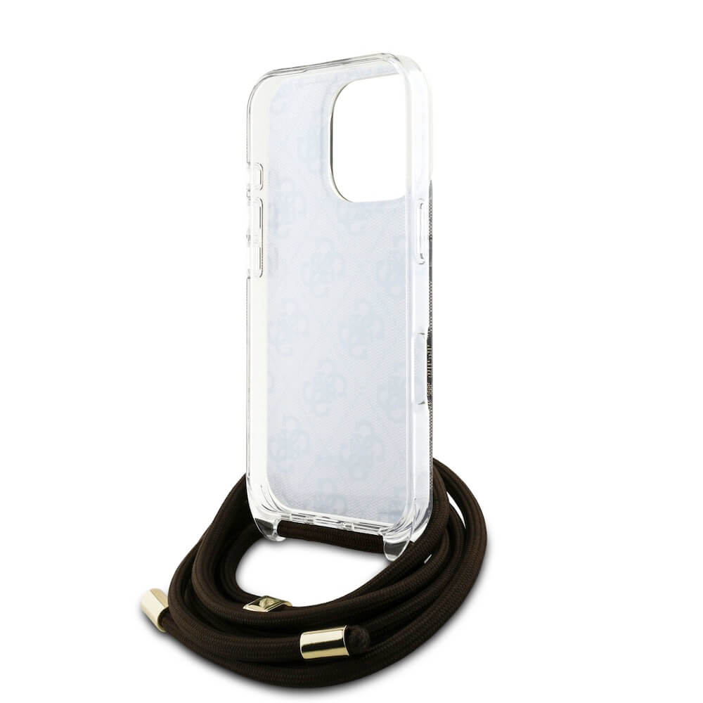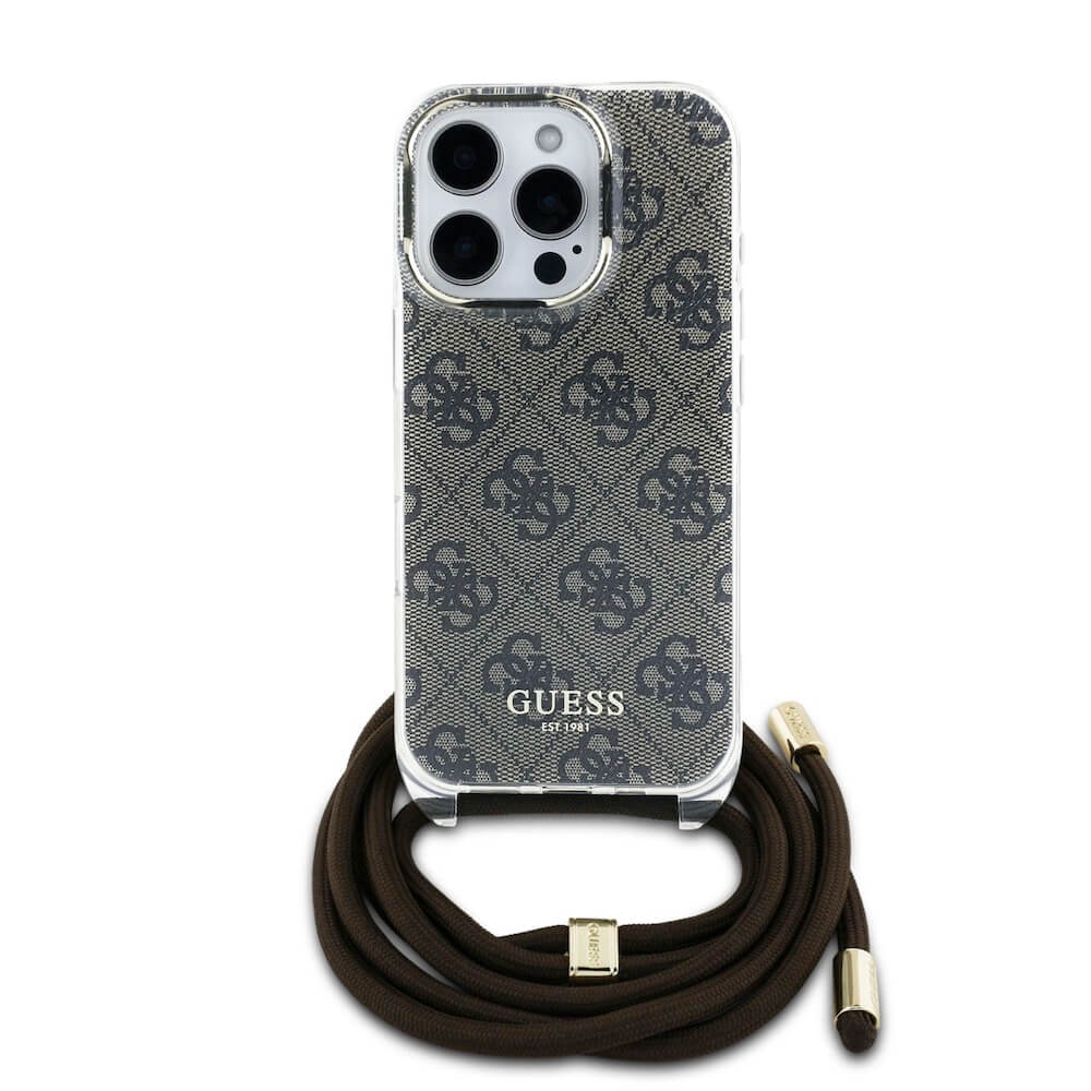 Дизайнерски кожен кейс с връзка за носене през врата за iPhone 16 Pro Max - Guess PU IML 4G Printed Case With Crossbody Strap (кафяв)