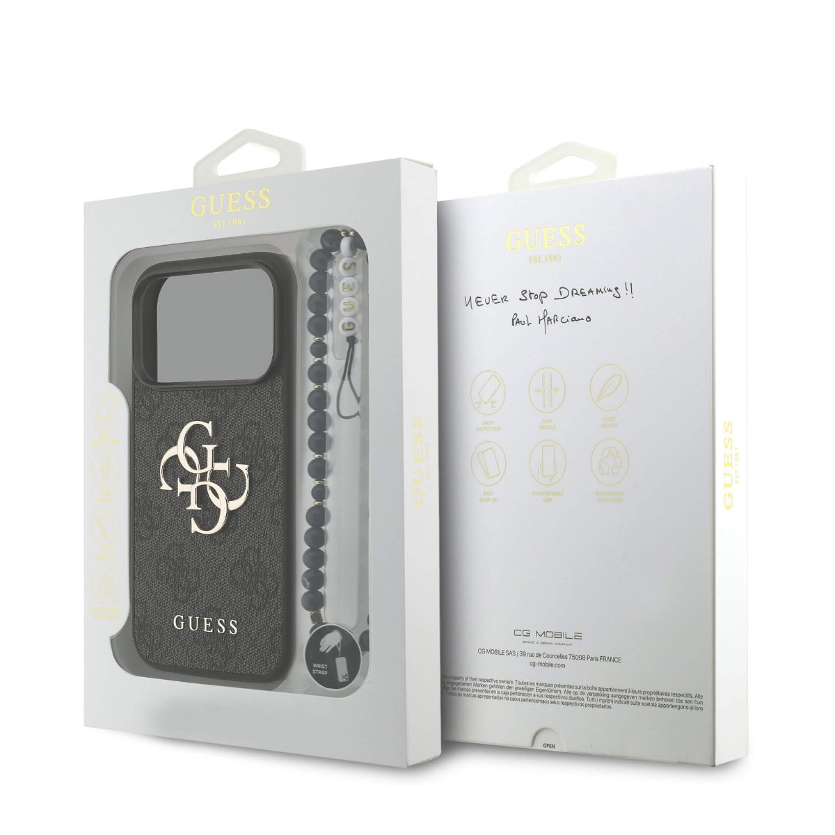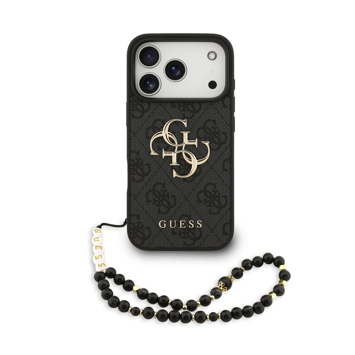 Дизайнерски кожен кейс с връзка за ръка за iPhone 17 Pro Max - Guess PU 4G Metal Logo Strap Case (черен)
