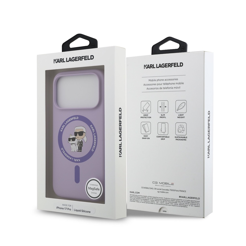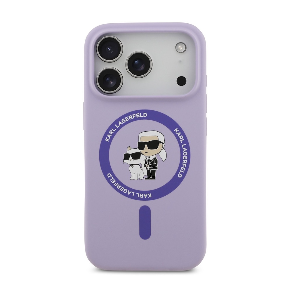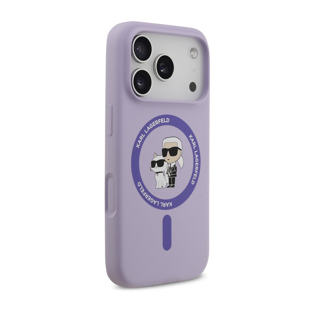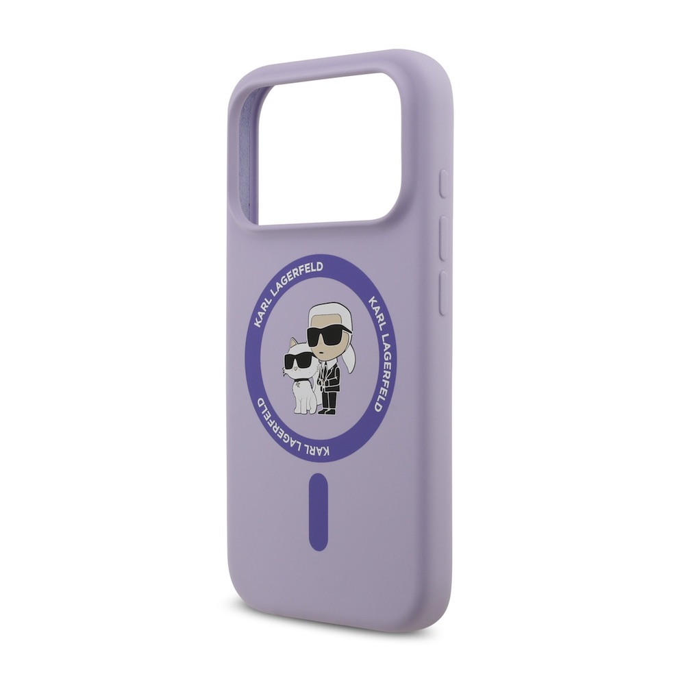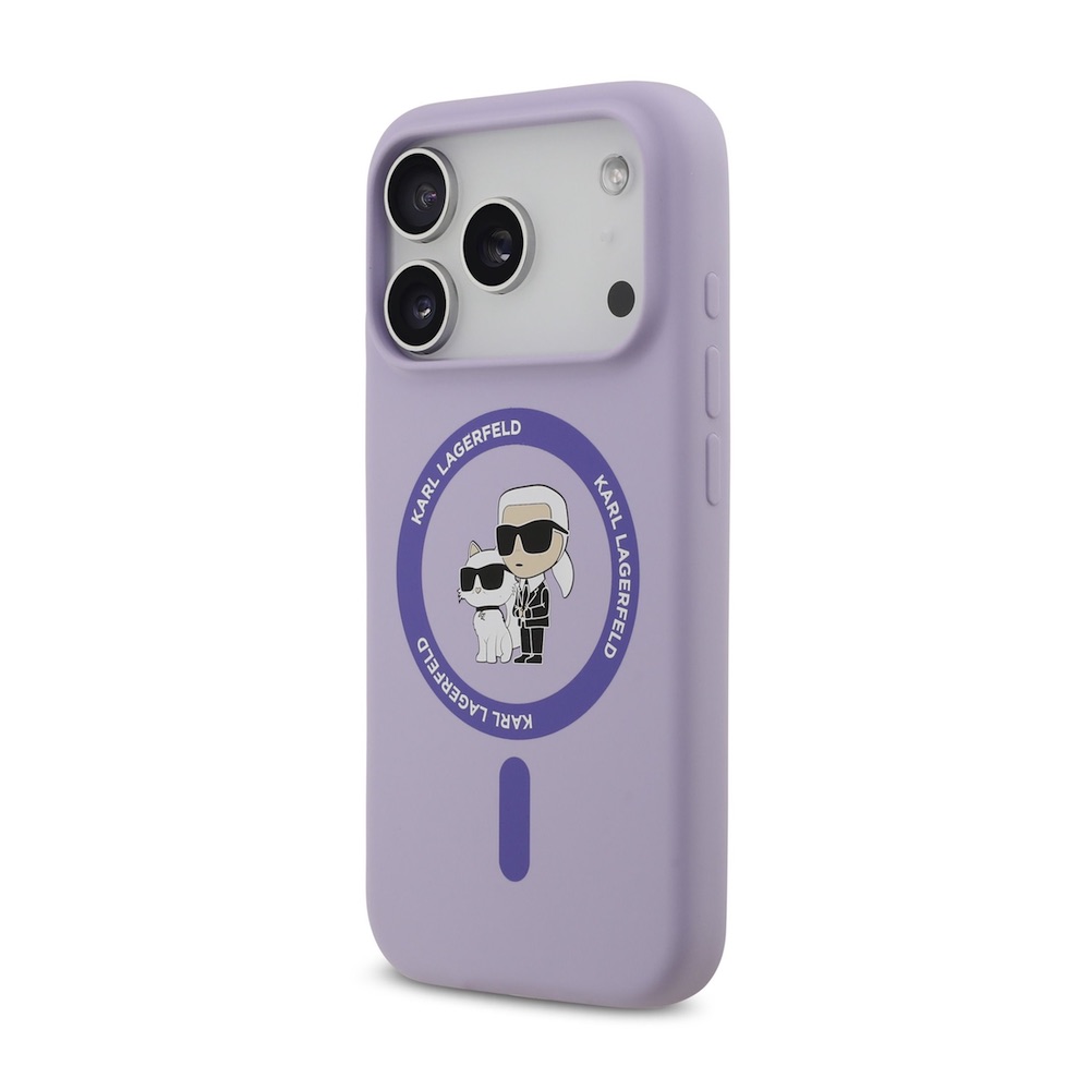 Дизайнерски силиконов кейс с MagSafe за iPhone 17 Pro - Karl Lagerfeld Liquid Silicone Karl and Choupette Heads MagSafe Case (лилав)