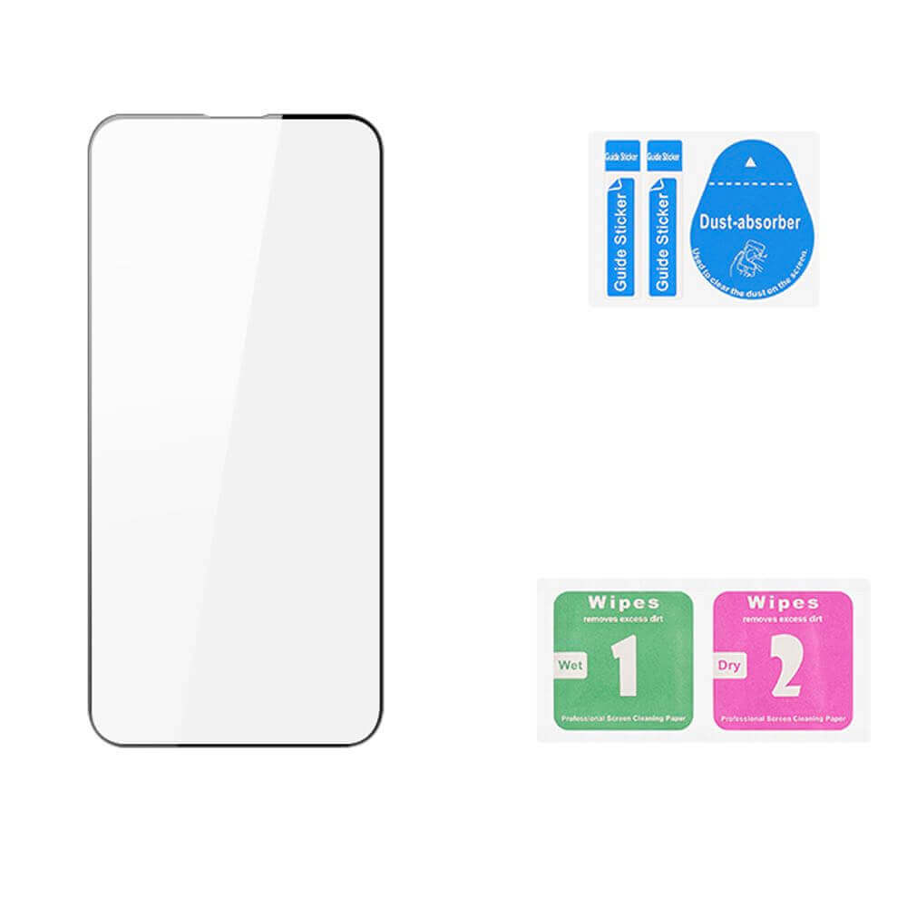 - 1 х Dux Ducis 10D Case Friendly Full Coveraged Tempered Glass - 1 x микрофибърна кърпичка - 1 х мокра кърпичка - 1 х антистатична лепенка за премахване на прашинки