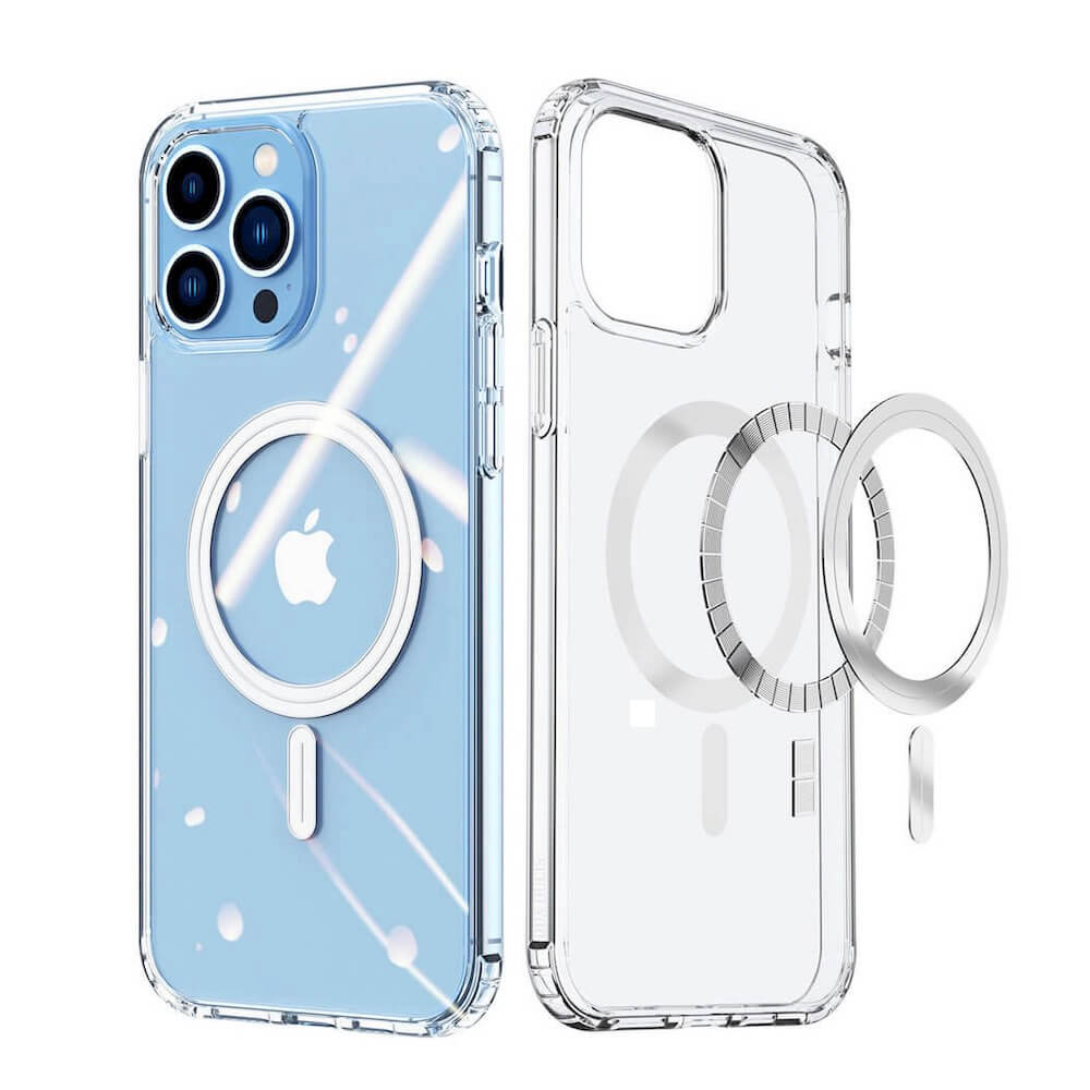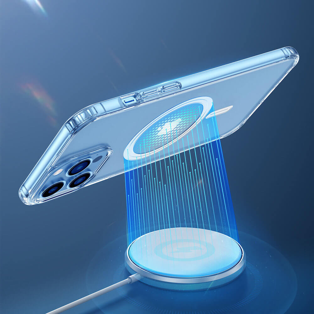 - Кейсът е снабден с магнит, благодарение на който е съвместим с MagSafe аксесоари. Това е изцяло нов стандарт за бързо и лесно свързване на аксесоари и безжични зарядни устройства
