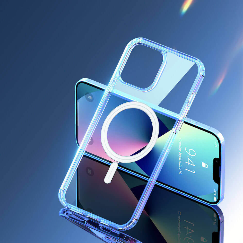 - Кейсът е снабден с магнит, благодарение на който е съвместим с MagSafe аксесоари. Това е изцяло нов стандарт за бързо и лесно свързване на аксесоари и безжични зарядни устройства