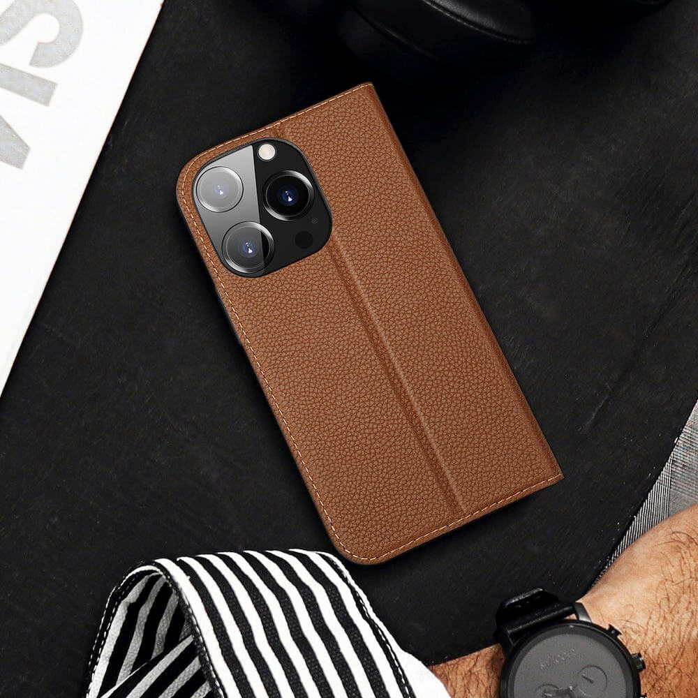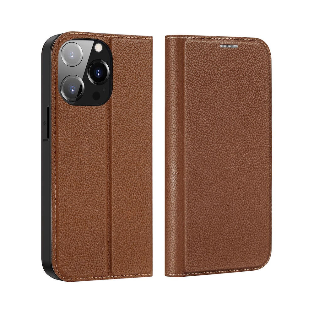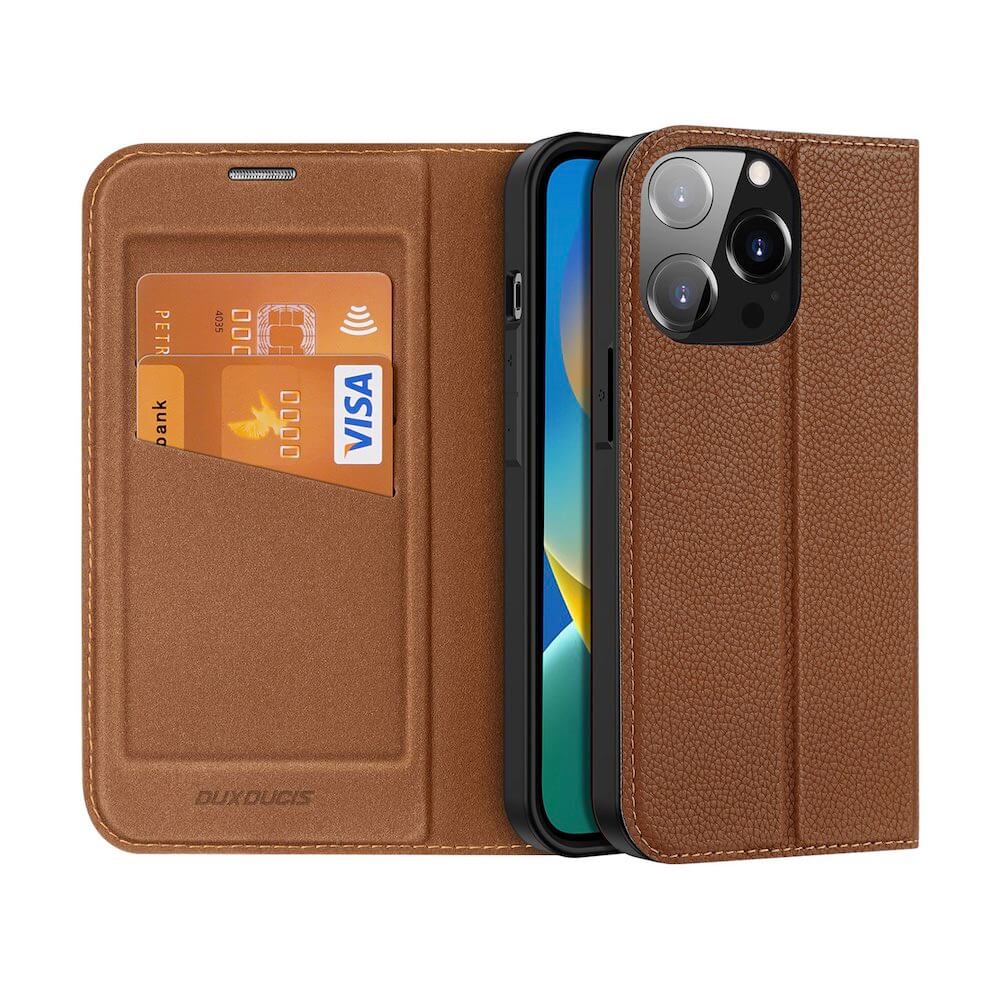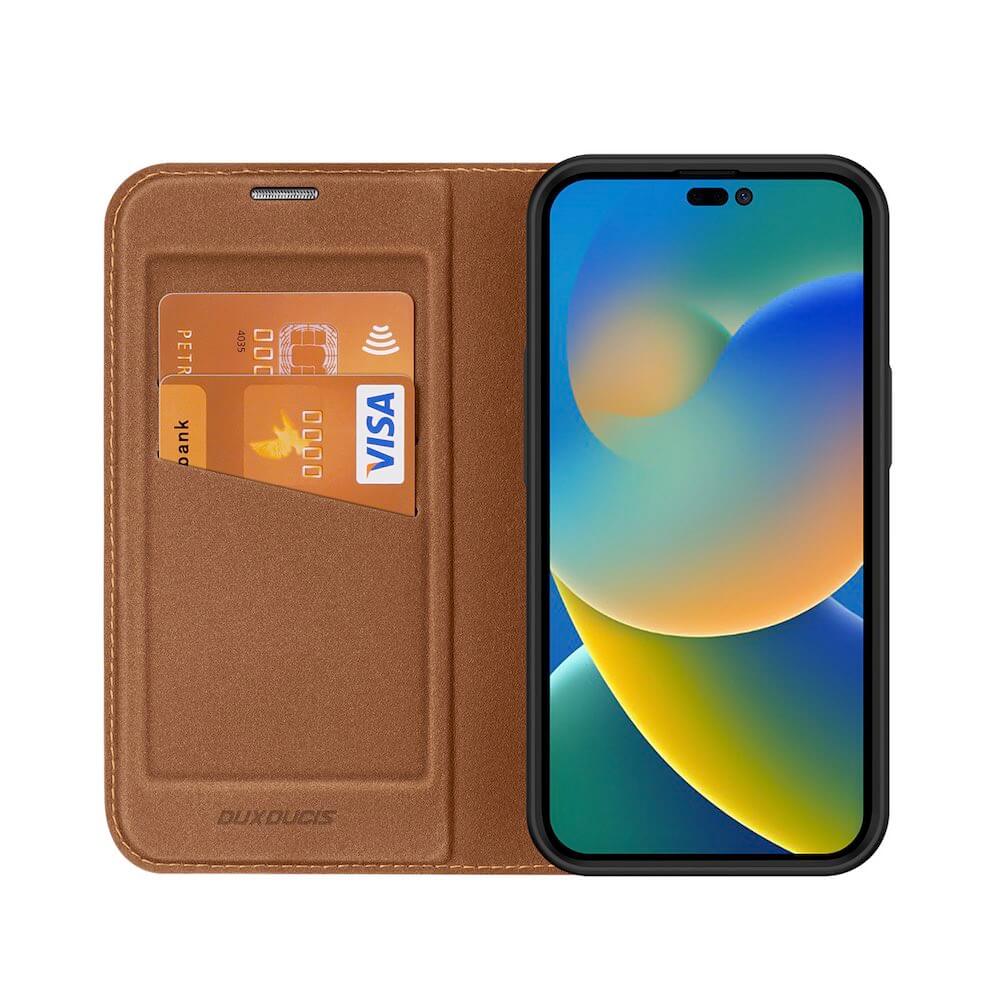 Dux Ducis Skin X2 Case - кожен калъф с поставка и отделение за кр. карти за iPhone 14 Pro (кафяв)