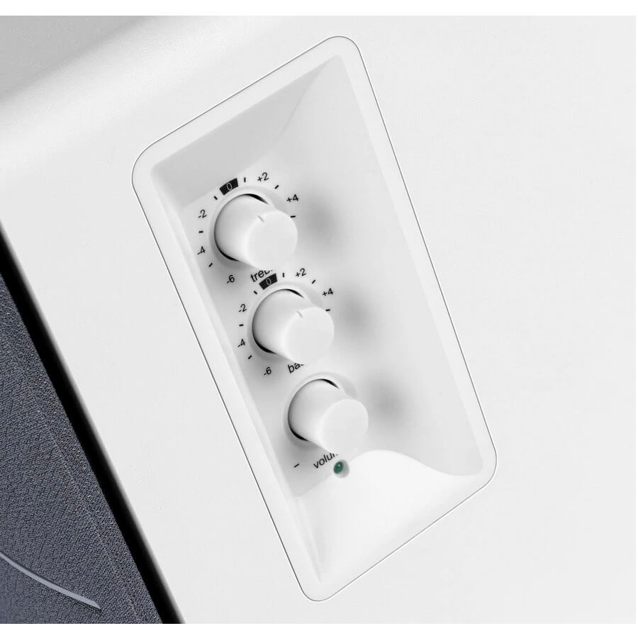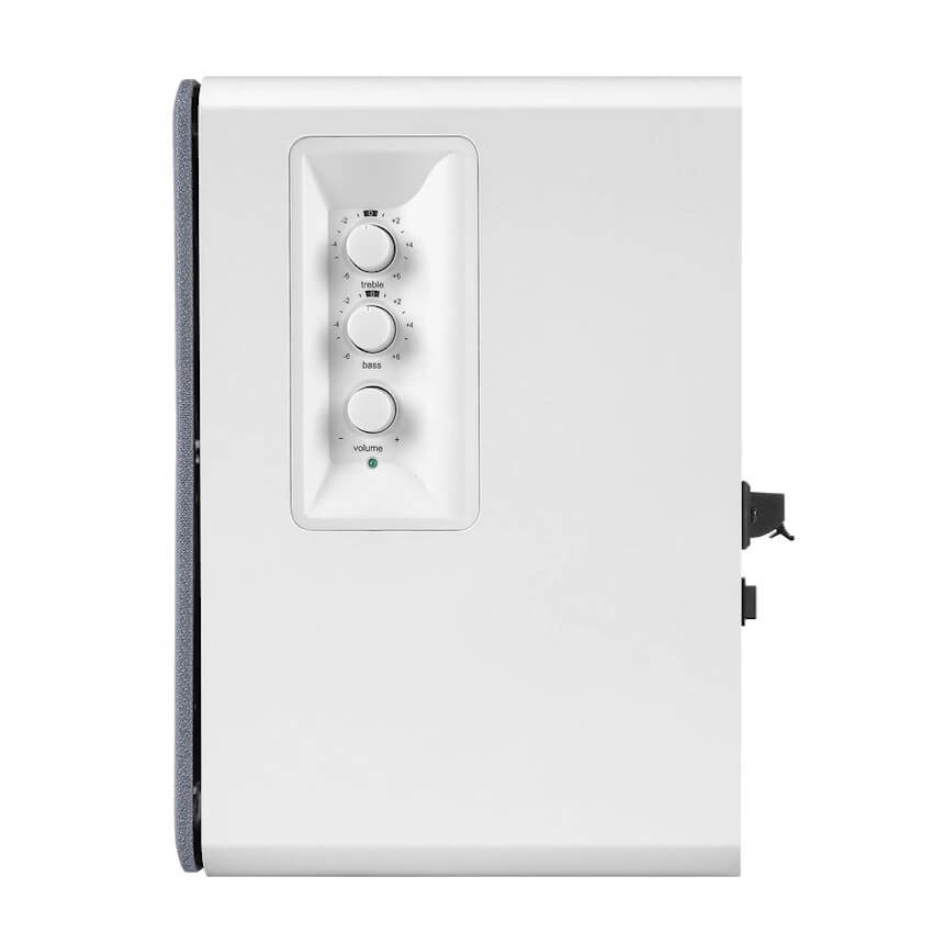 - С включеното компактно удобно дистанционно управлениемМожете да регулирате силата на звука и да заглушите високоговорителите, когато е необходимо. Edifier R1280T идва с вграден контрол на тоновете от страната на активния високоговорител. В зависимост от предпочитанията, можете да направите микро корекции на високите и ниските честоти от -6 до +6 db. Дигиталният контрол на силата на звука автоматично се настройва на удобно ниво всеки път, когато високоговорителите са включени