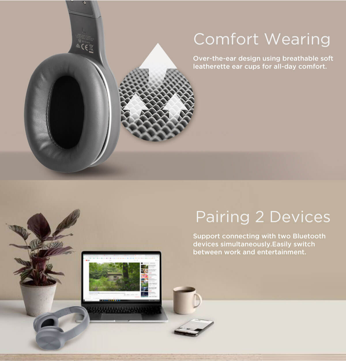 - Ергономично прилягане - изработени от дишаща високо еластична основа и покритие от изкуствена кожа. Затворният дизайн на слушалките спомага за намаляване на външния шум и поддържане на звука