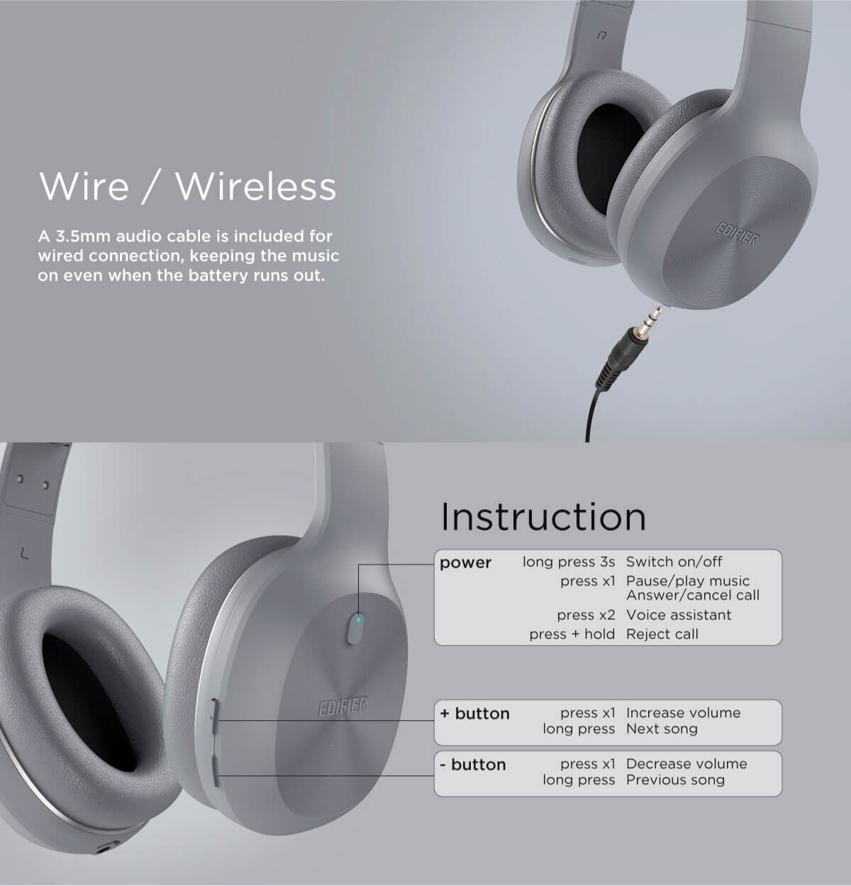 - Безжична и кабелна връзка - Използвайте 3,5 мм към 3,5 мм конектор за смяна на W600BT към кабелен режим на слушалки. Тази функция е изключително полезна, когато батерията в слушалките ви е празна. Слушалките се зареждат чрез включен USB-C кабел