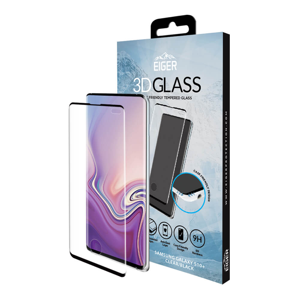 Eiger 3D Glass Case Friendly Curved Tempered Glass - калено стъклено защитно покритие с извити ръбове за целия дисплей на Samsung Galaxy S10 Plus (черен-прозрачен)