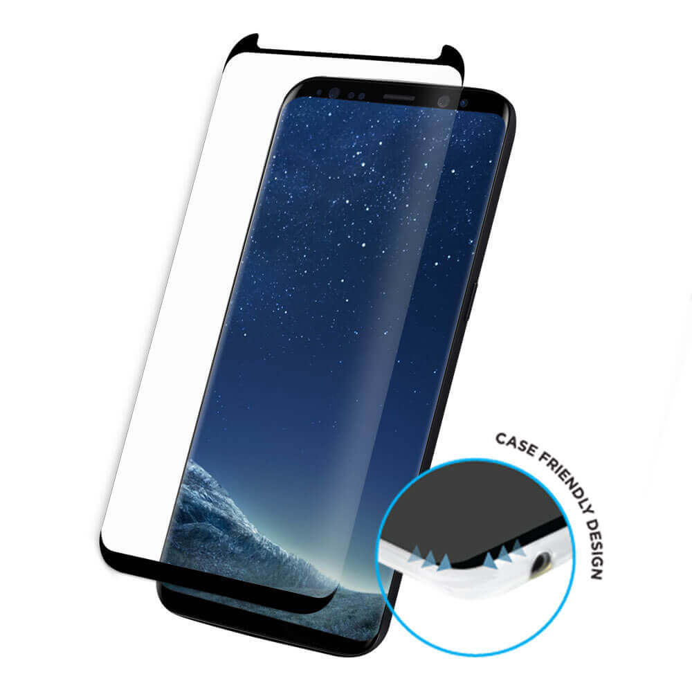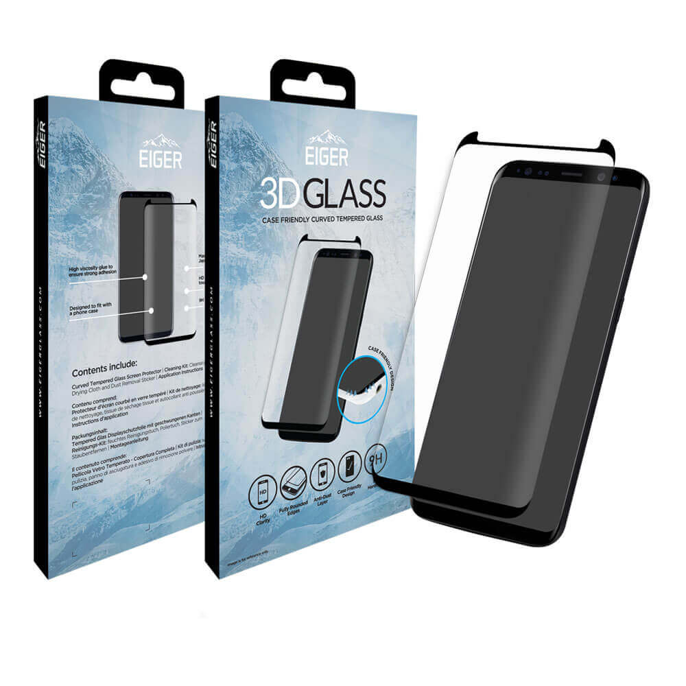 Eiger 3D Glass Case Friendly Curved Tempered Glass - калено стъклено защитно покритие с извити ръбове за целия дисплея на Samsung Galaxy S8 Plus (черен-прозрачен)