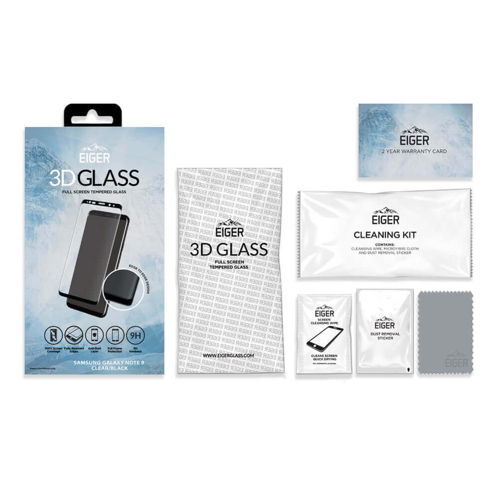 Eiger 3D Glass Edge to Edge Curved Tempered Glass - калено стъклено защитно покритие с извити ръбове за целия дисплея на Samsung Galaxy Note 9 (черен-прозрачен)