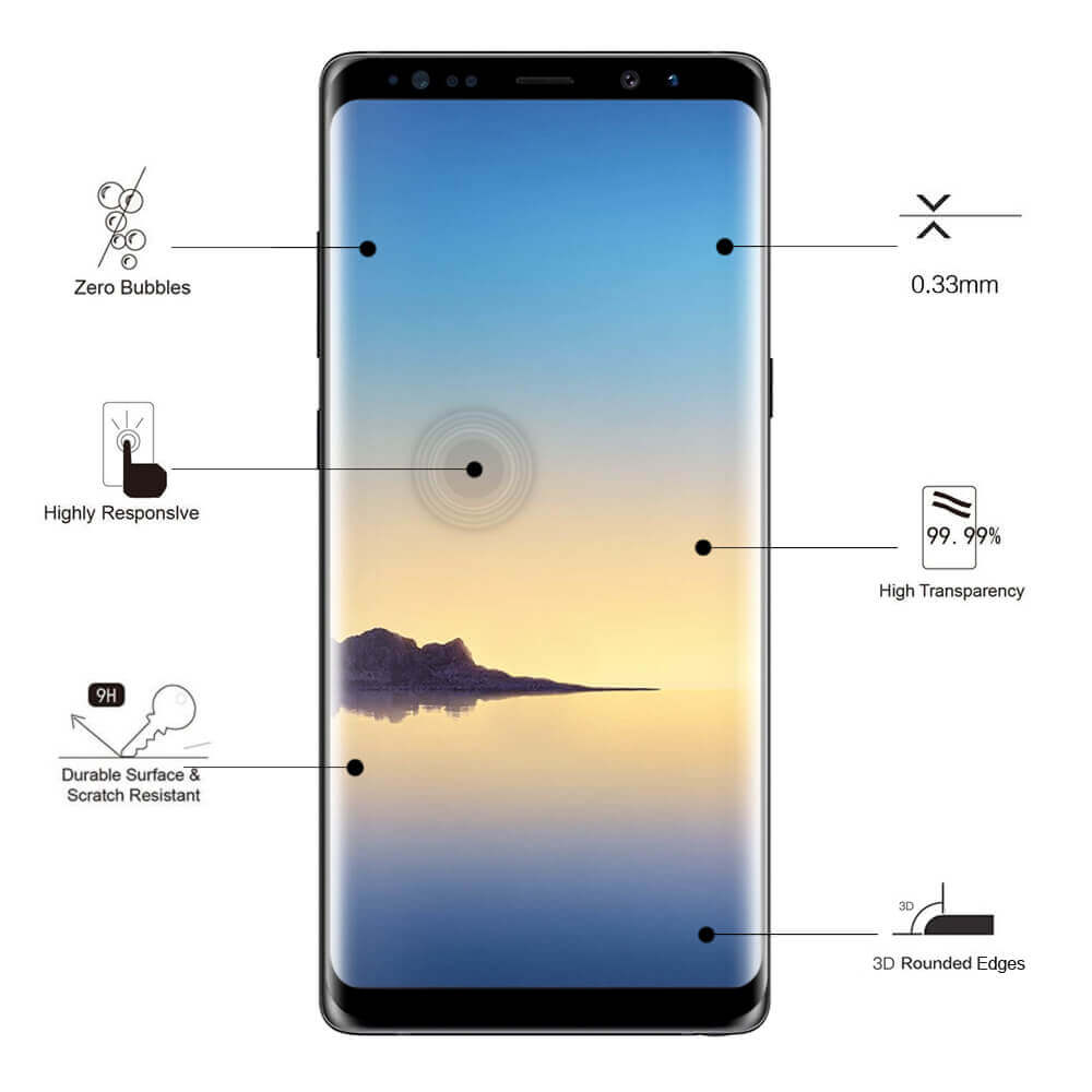 § Защитно покритие изработено от калено стъкло с извити ръбове, което обхваща целия дисплей на Samsung Galaxy Note 9