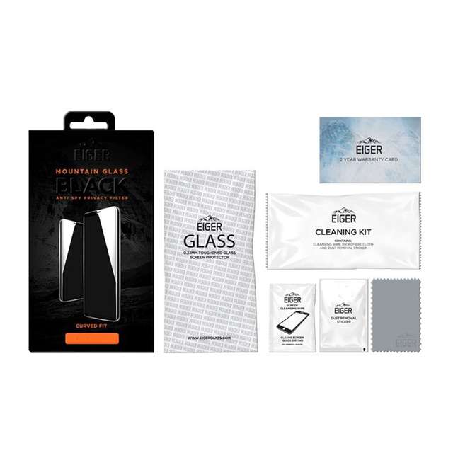 - 1 x Eiger Mountain Glass Black Curved Anti-Spy Privacy Filter Tempered Glass Screen Protector - 1 x микрофибърна кърпичка - 1 х мокра кърпичка - 1 х антистатична лепенка за премахване на прашинки