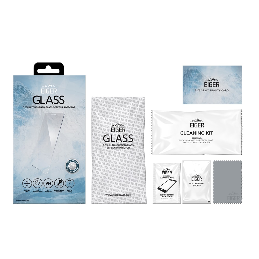 - 1 х Eiger ‘Asahi’ Tempered Glass Protector - 1 x микрофибърна кърпичка - 1 х мокра кърпичка - 1 х антистатична лепенка за премахване на прашинки