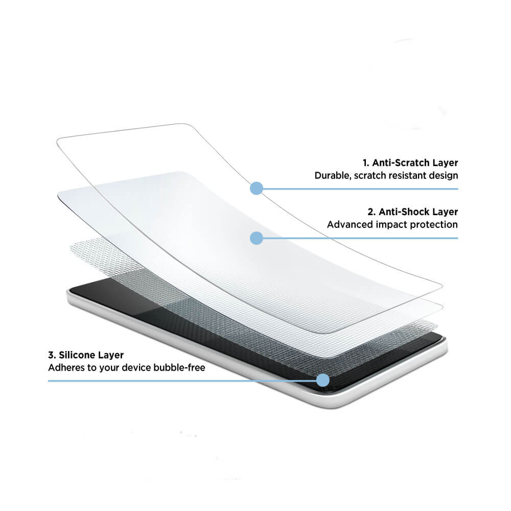 - Трислойното Tri Flex покритие съдържа: Anti-Scratch (срещу надраскване), Anti-Shock (срещу удари) и лек силиконов слой за плътно и сигурно залепяне върху дисплея