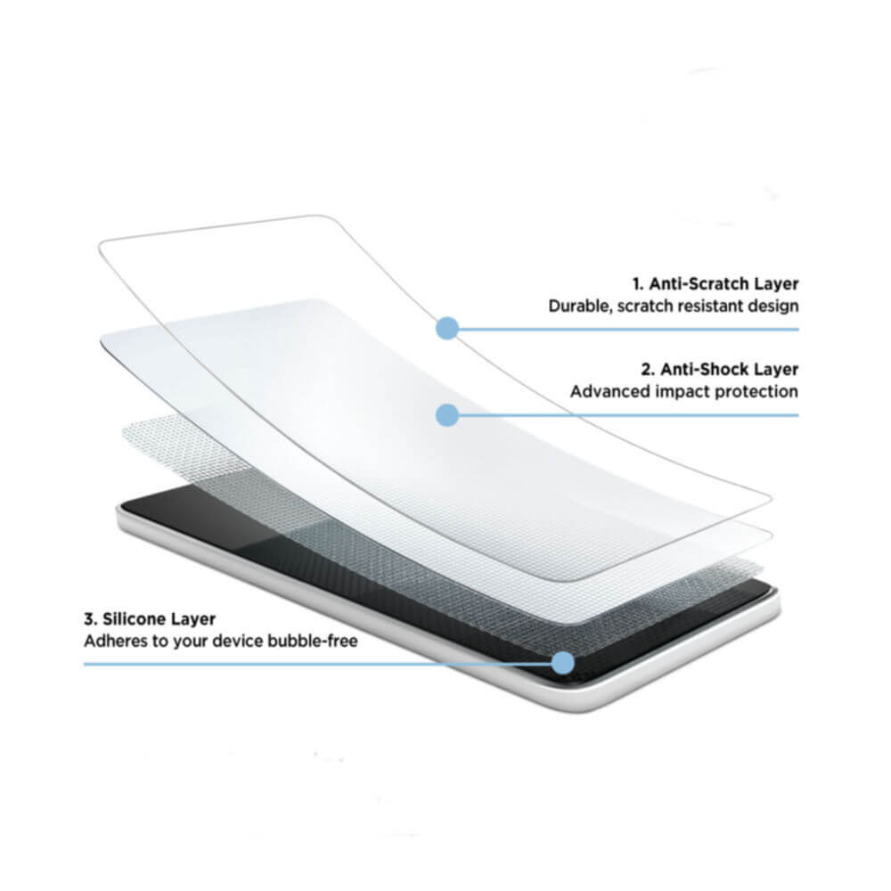 § Протектора използва трислоен дизайн, чрез който предоставя защита за екрана на смартфона
