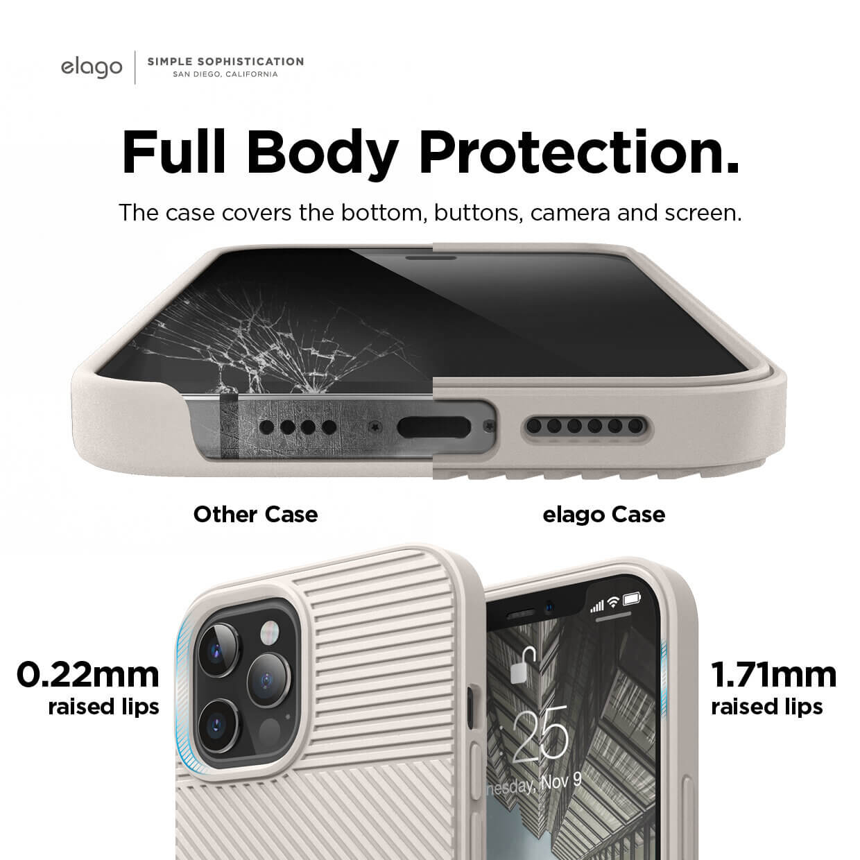 - Калъфът изпъква над камерата с 2.2 мм, което е напълно достатъчно за да оставяте безопасно телефона си по гръб и с 1.70 мм над дисплея, което пък ви позволява да го оставяте и по екран, без да се притеснявате, че повърхността ще има пряк допир с вашия телефон