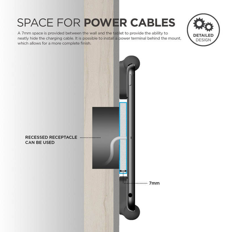 § Дизайнът на поставката е изработен така, че да остане място между нея и стената, за да можеш да прокараш кабел за зареждане или в случай, че разполагаш с розетка с USB порт, можеш да я прикриеш с поставката (да остане зад нея) и да свържеш кабела за зареждане към нея