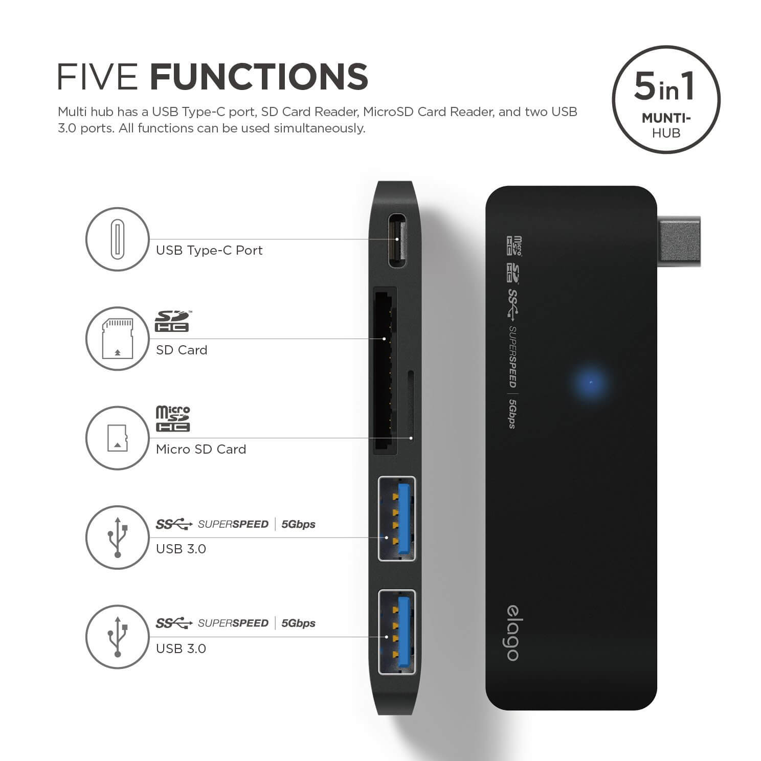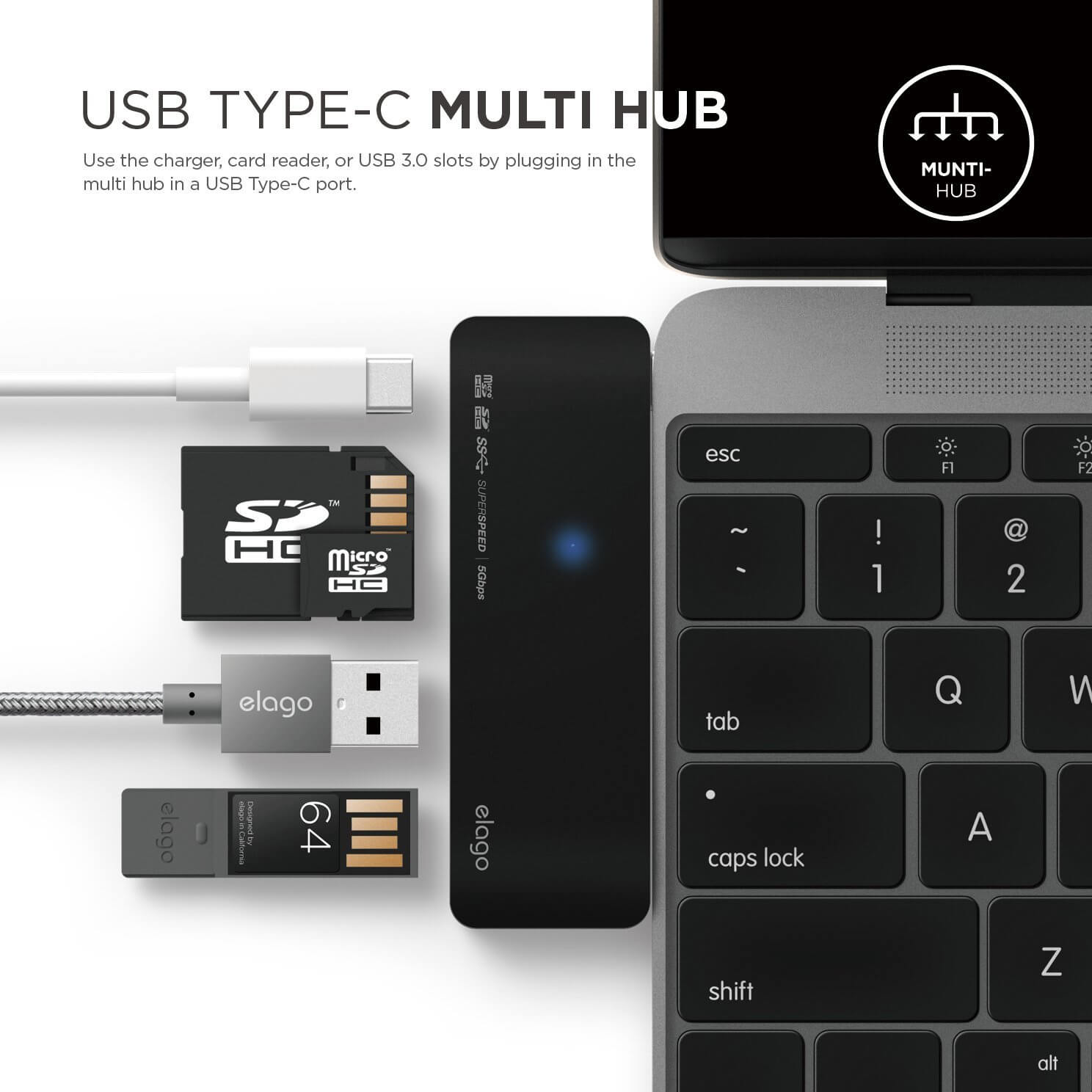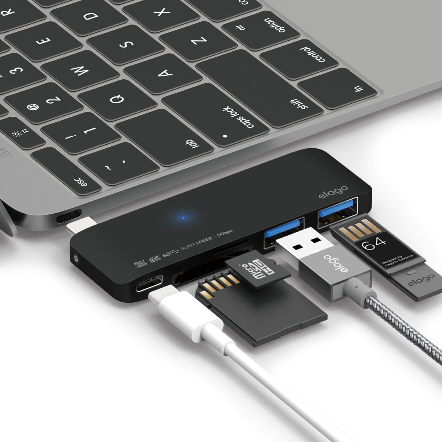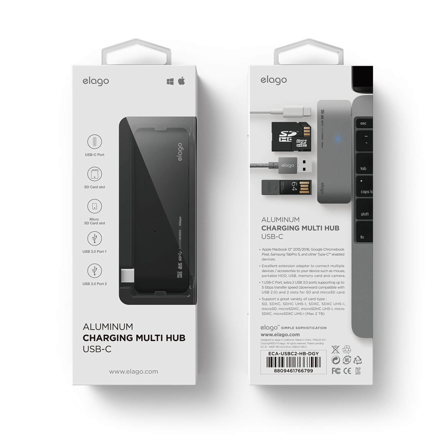 Elago Multi USB-C Hub - USB-C хъб към 2xUSB 3.0, MicroSD, SD и USB-C за MacBook и устройства с USB-C порт (черен)