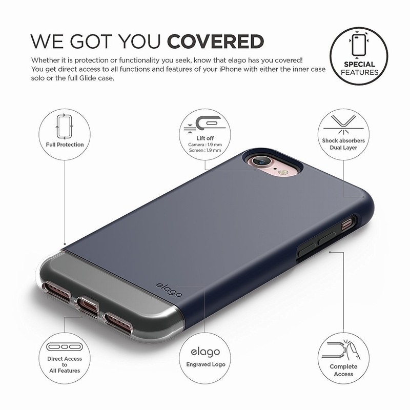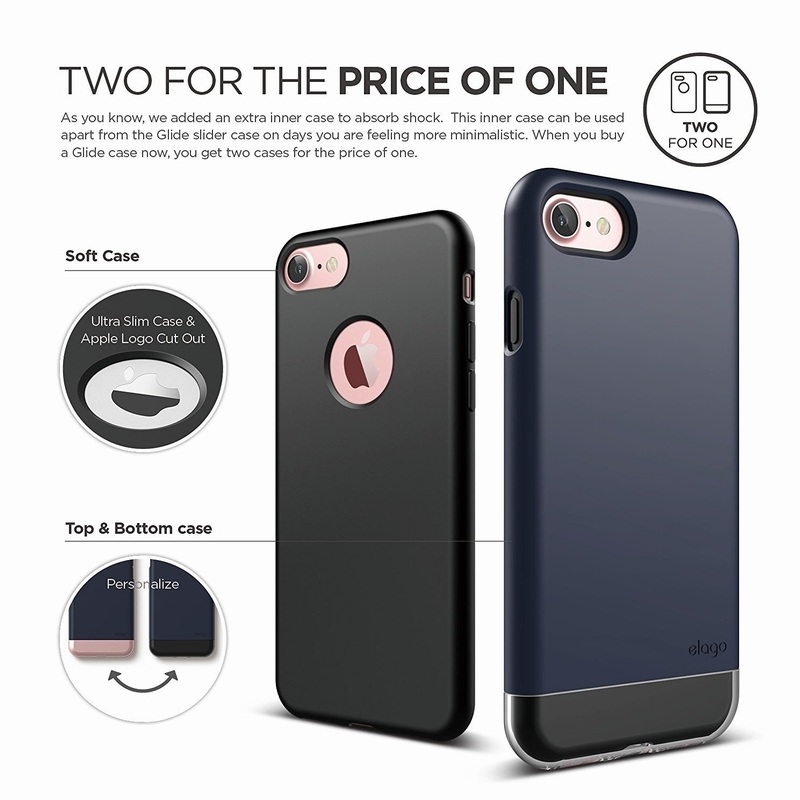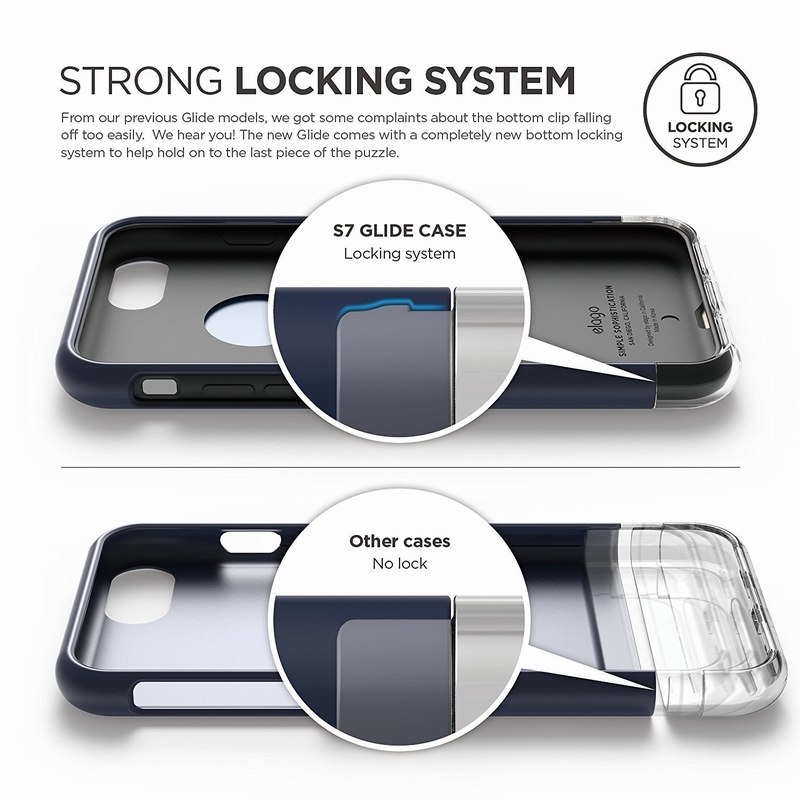 § С новата серия Glide S7 реално получаваш не един, а два кейса! За разлика от традиционния Glide кейс, който е изработен от две съединяващи се твърди части, при новия Glide кейс първо поставяш телефона в Elago Slim Fit Soft кейс, след което съединяваш двете части на Glide кейса