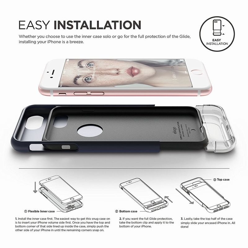 § Внимание: можете да използвате самостоятелно включения в комплекта Elago Slim Fit Soft Case, но за да използвате Glide кейса, то трябва първо да поставите телефона си в силиконовия калъф и след това в Glide кейса