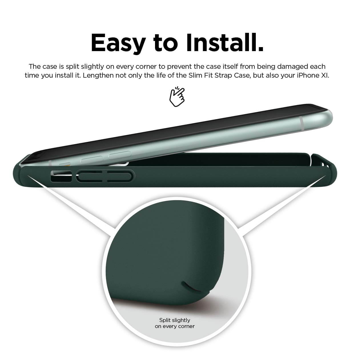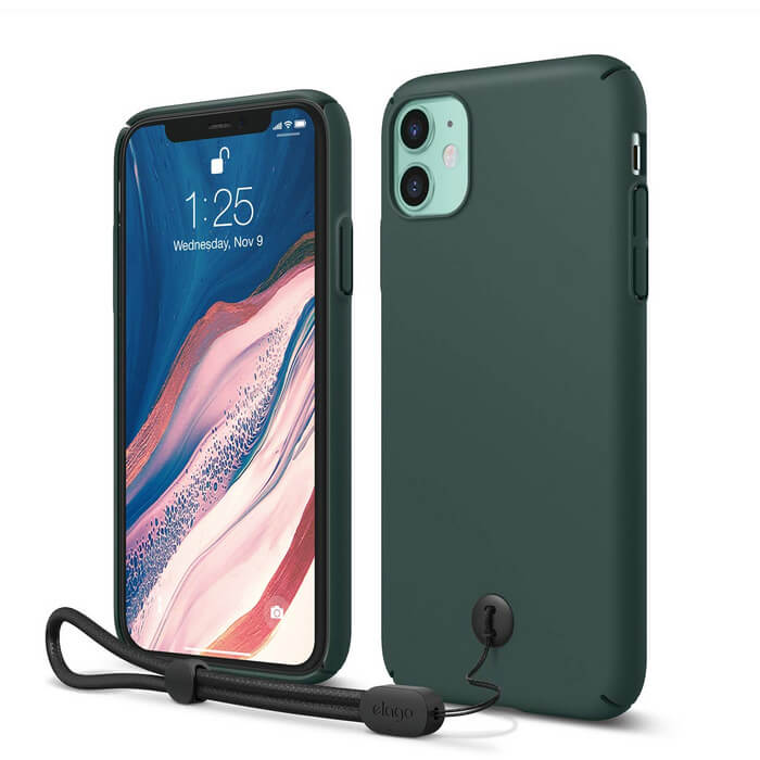 Elago Slim Fit Strap Case - качествен поликарбонатов кейс с каишка за китката за iPhone 11 (тъмнозелен)