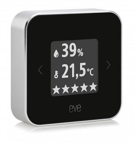 - Измерване на влажността - Ниската влажност води до заболявания на гърлото, очите и кожата, докато високата влажност увеличава риска от алергии и астма. И двете крайности увреждат електрониката и обзавеждането. С Eve Room ще знаете дали да активирате овлажнителя, изсушителя или вентилатора