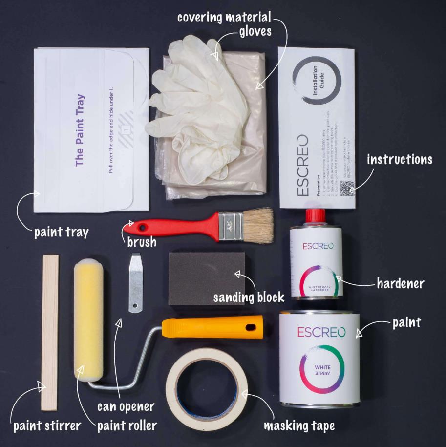 - Наръчник с инструкции; - Втвърдител за боя ESCREO, достатъчен за 2 слоя; - Отварачка и бъркалка за боя; - Еко сгъваема ваничка за боя; - Валяк за боя; - Четка за боядисване; - Защитно тиксо; - Защитен покривен найлон; - Ръкавици; - Шкурка;