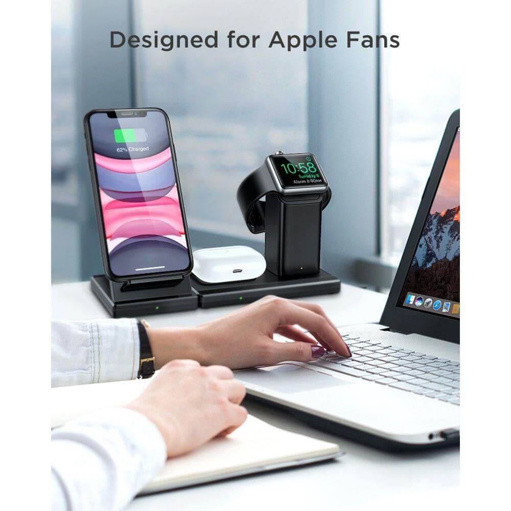 - Зареждате едновремено до три устройства - Apple Watch (с кабел, който се поставя в специално за това място), AirPods с кейс за безжично зареждане (до 5W), и Qi-съвместим смартфон (до 10W)
