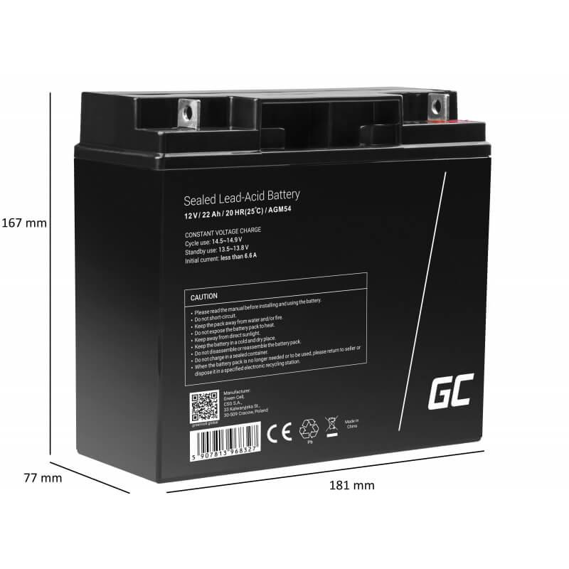 - 1 x Green Cell AGM battery 12V Lead-Acid Battery (22Ah)