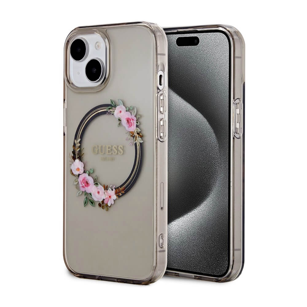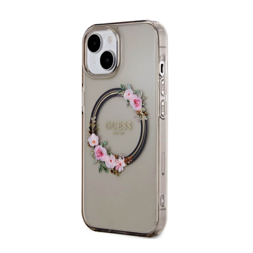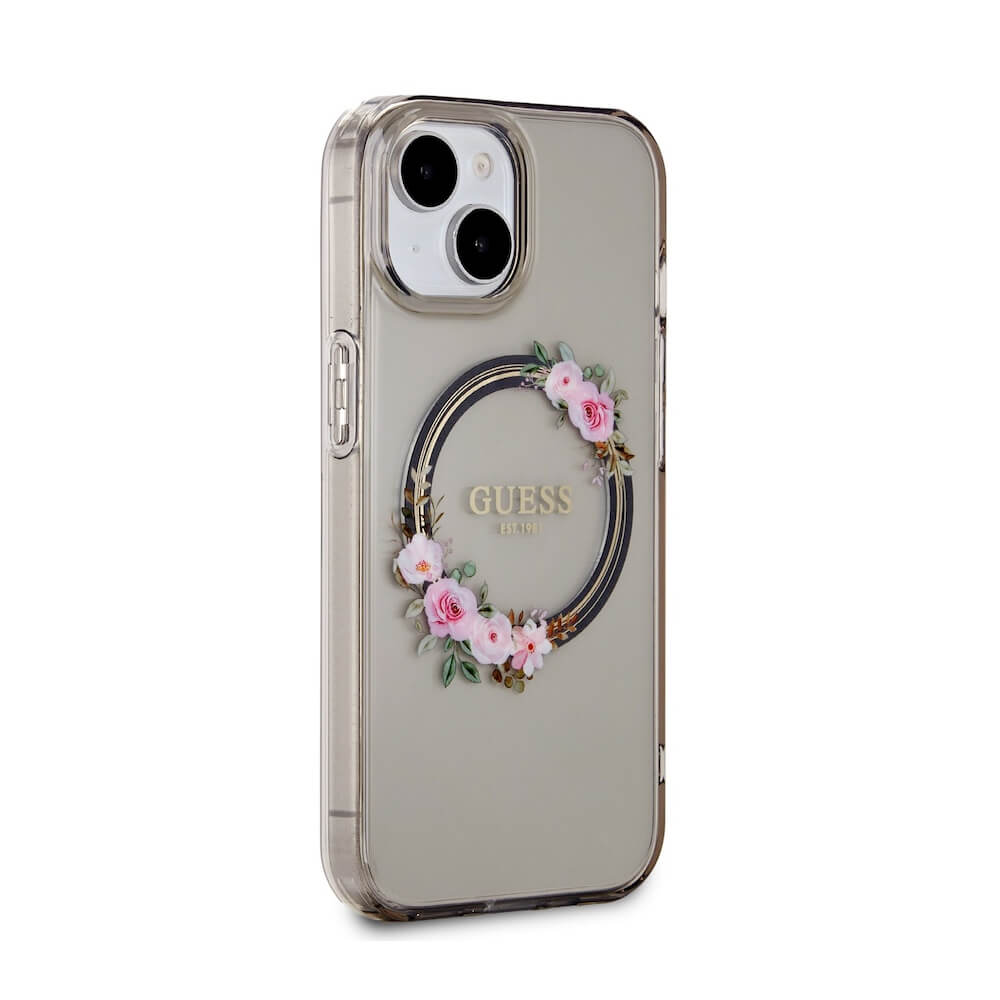 Guess Flowers Ring Glossy Logo MagSafe Case - хибриден удароустойчив кейс с MagSafe за iPhone 15 (черен-прозрачен)