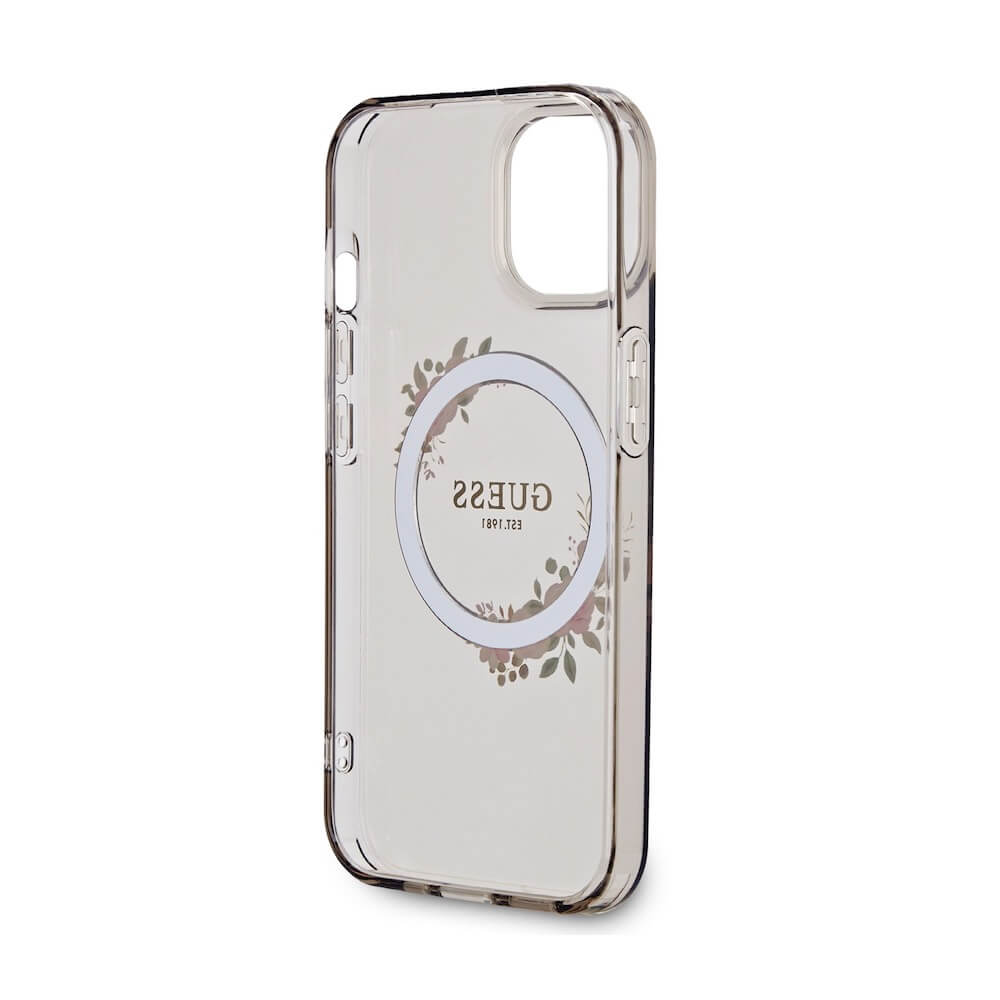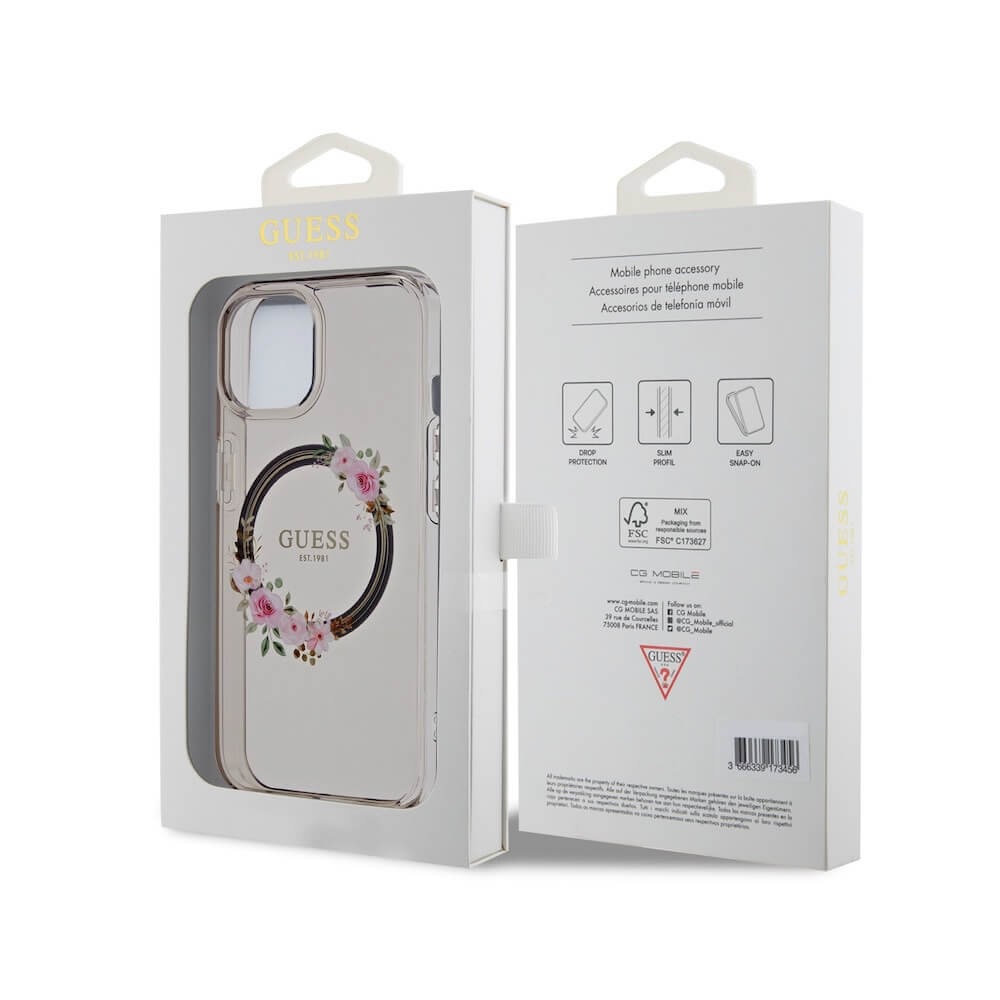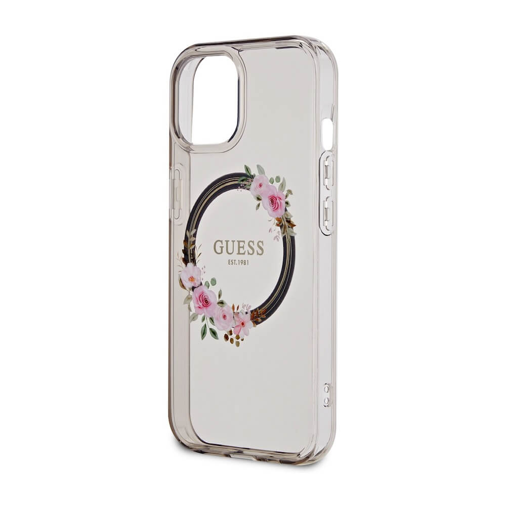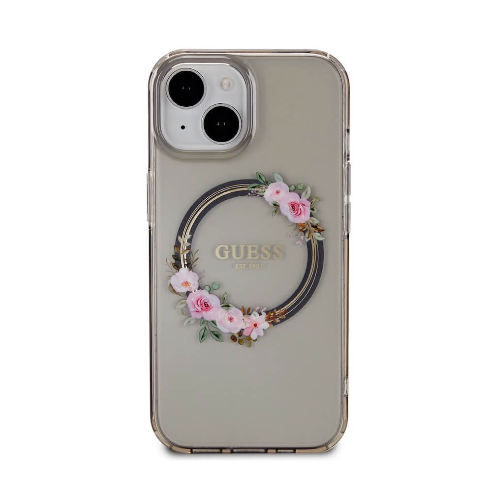 Guess Flowers Ring Glossy Logo MagSafe Case - хибриден удароустойчив кейс с MagSafe за iPhone 15 (черен-прозрачен)