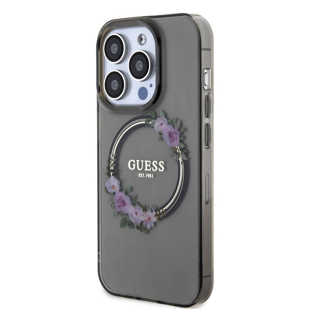 Guess Flowers Ring Glossy Logo MagSafe Case - хибриден удароустойчив кейс с MagSafe за iPhone 15 Pro Max (черен-прозрачен)