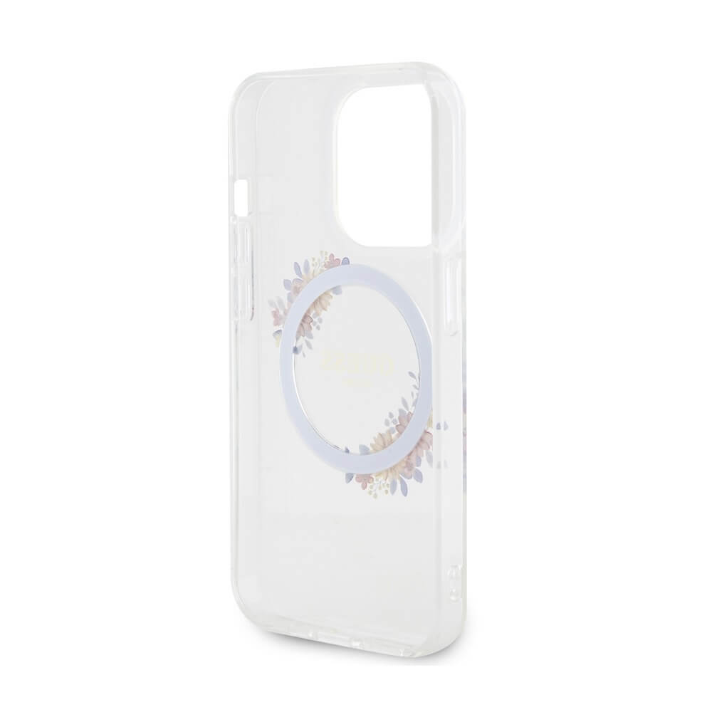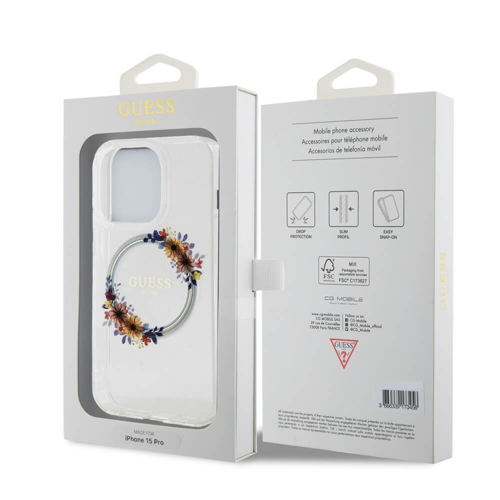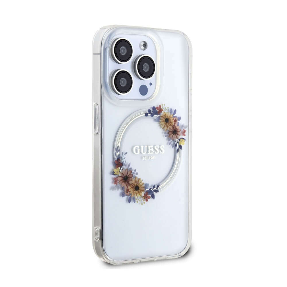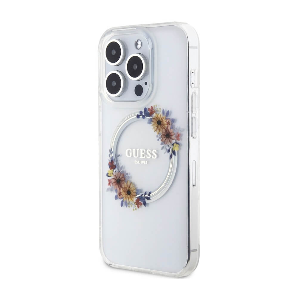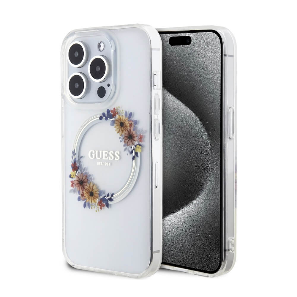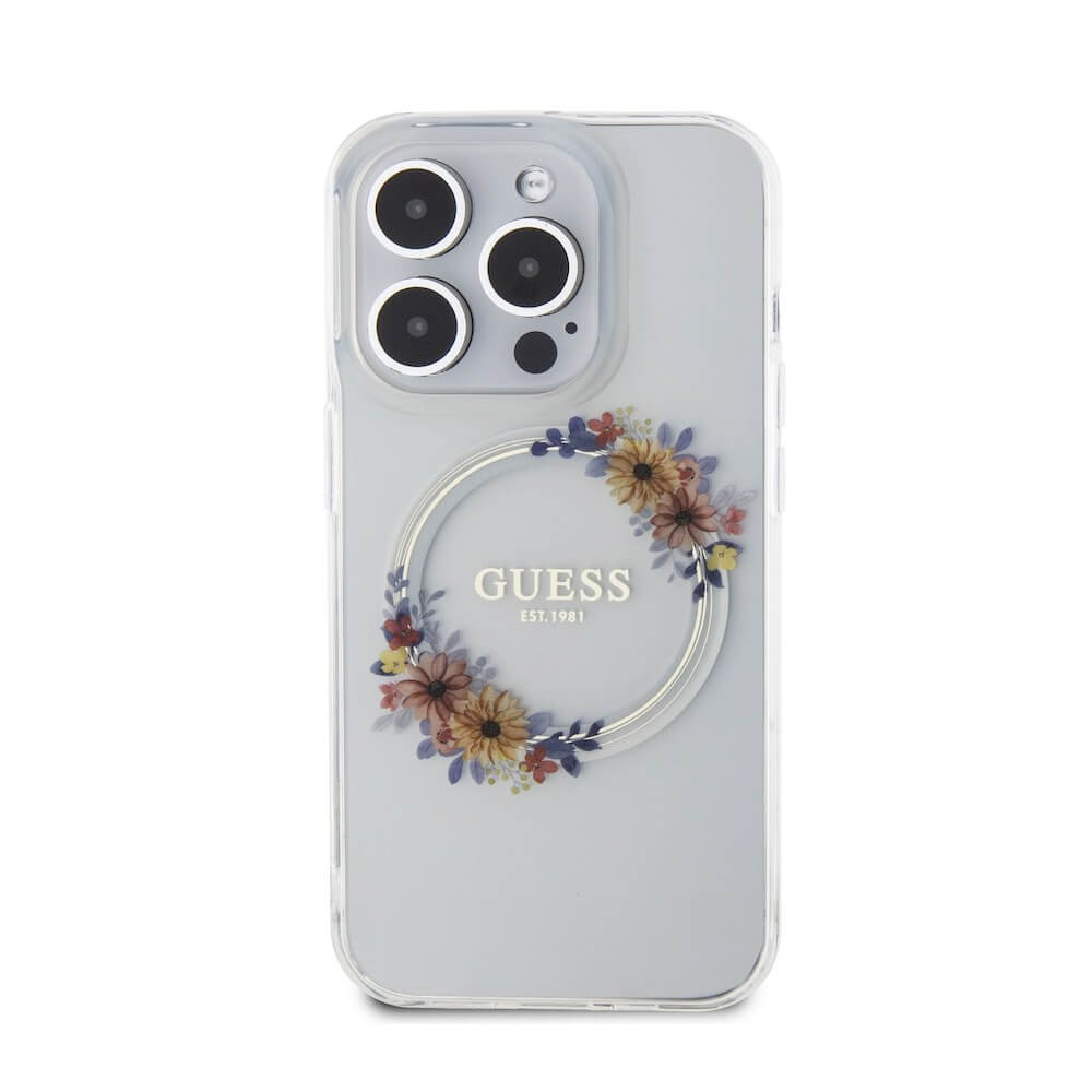 Guess Flowers Ring Glossy Logo MagSafe Case - хибриден удароустойчив кейс с MagSafe за iPhone 15 Pro (прозрачен)
