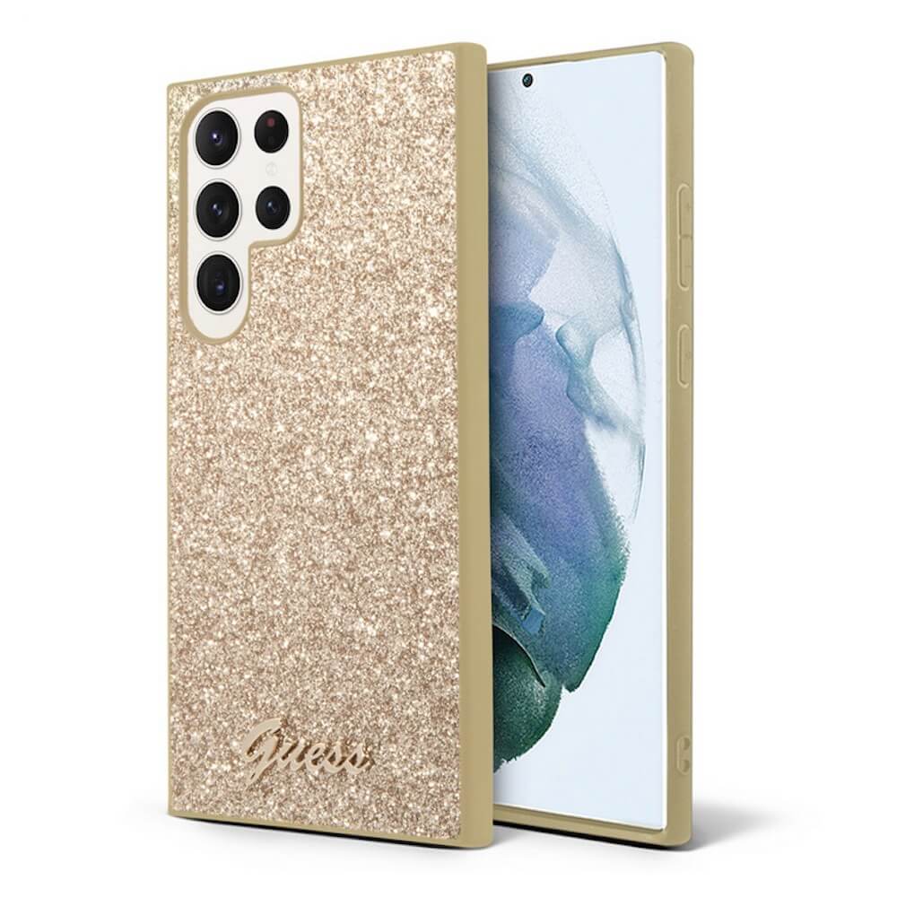 Guess Glitter Flakes Metal Logo Case - хибриден удароустойчив кейс за Samsung Galaxy S23 Ultra (златист)