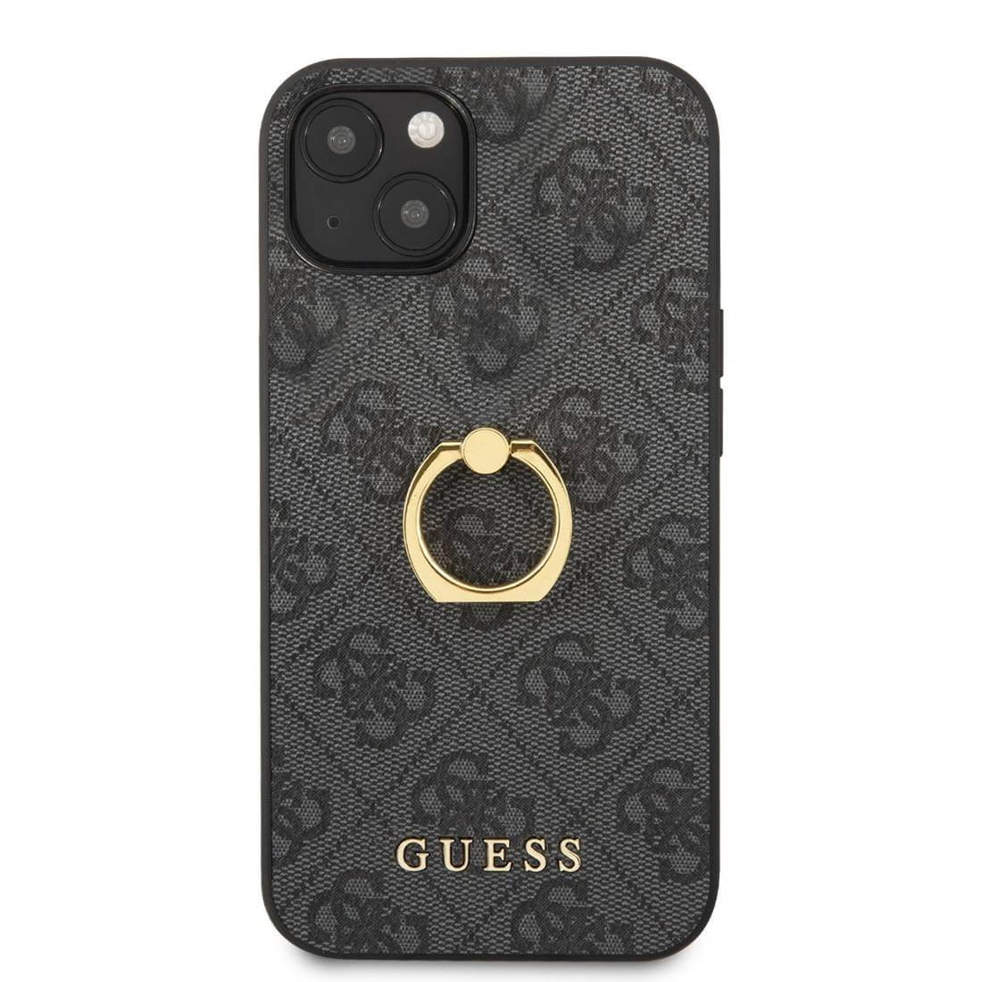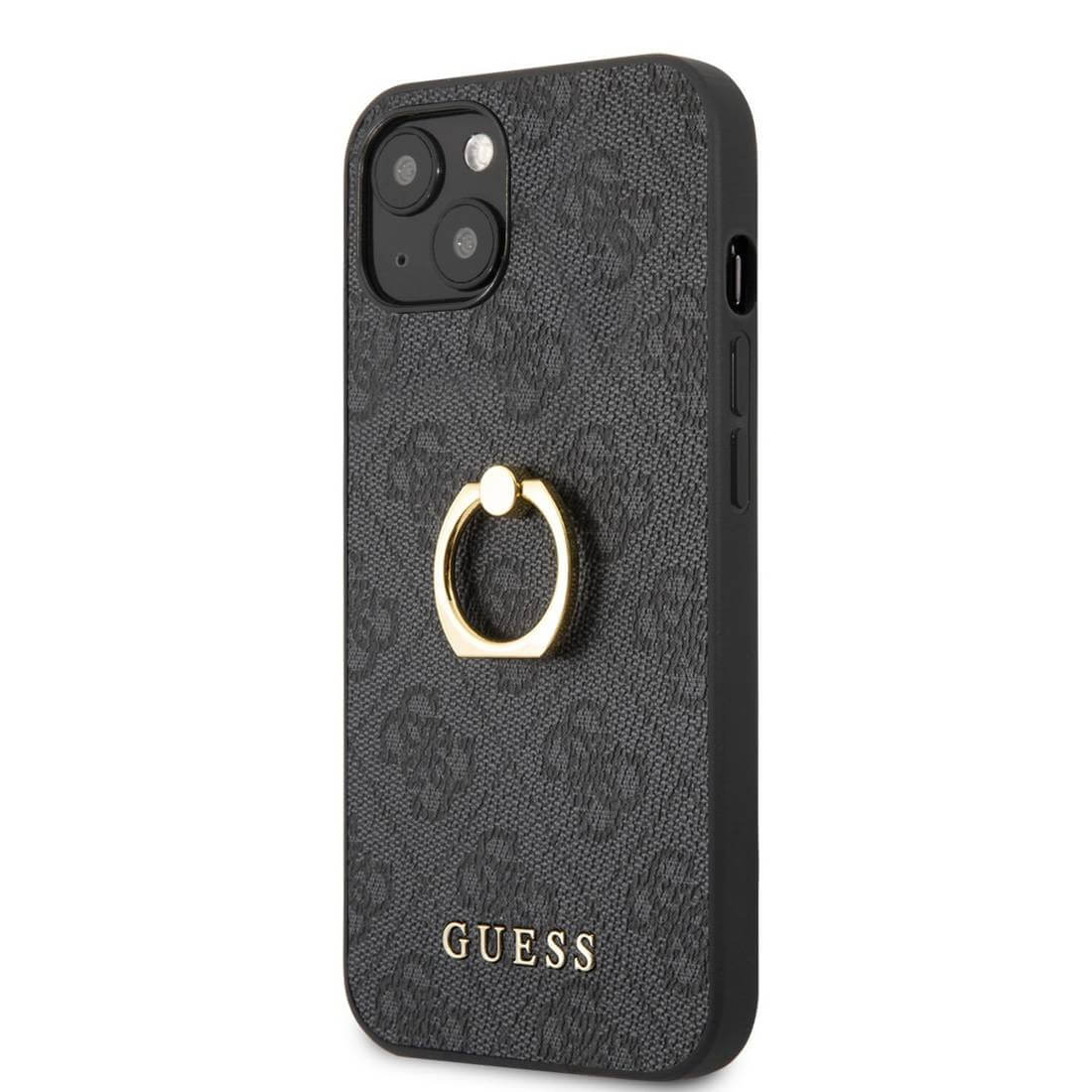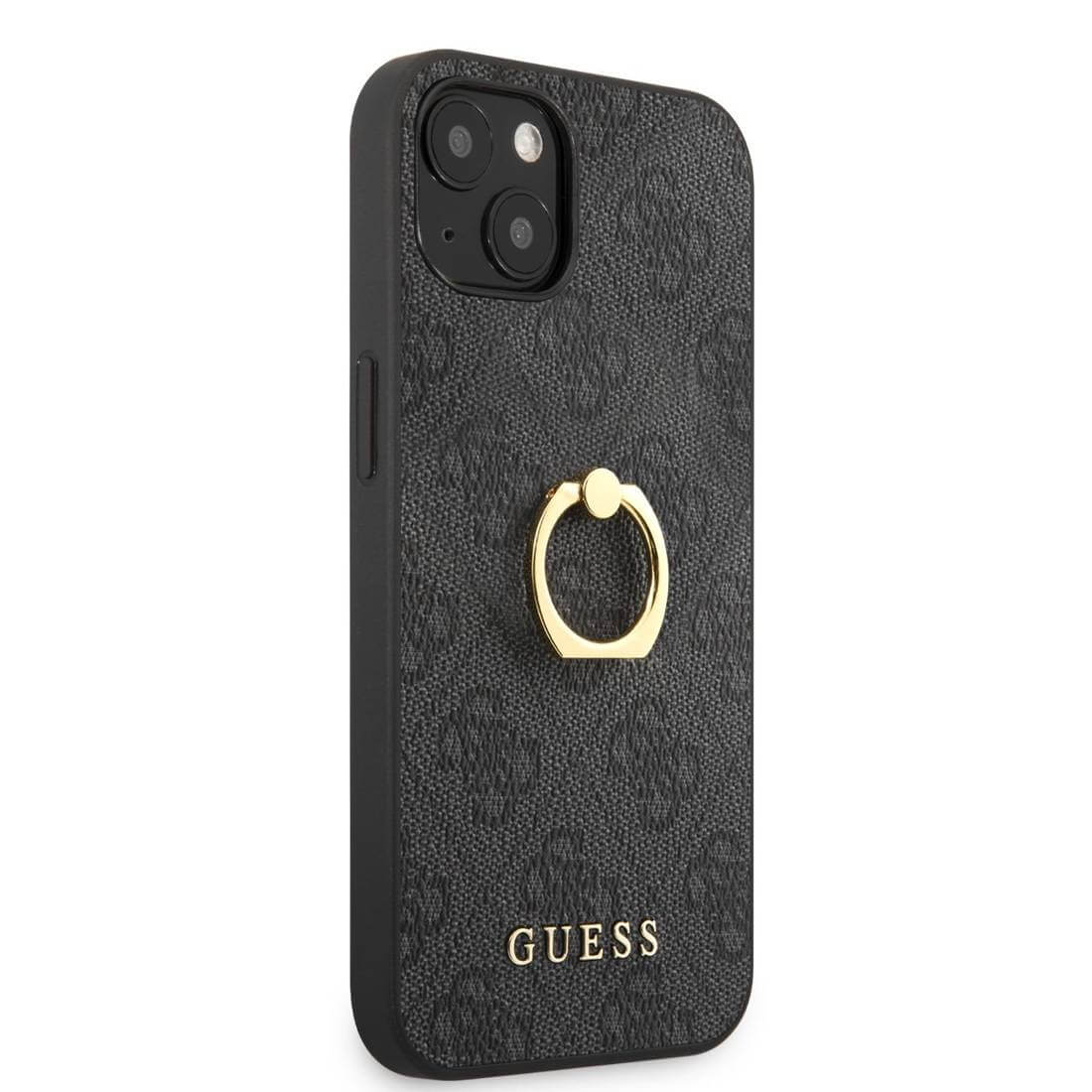 Guess Hard Case 4G With Ring Stand - дизайнерски кожен кейс с пръстен против изпускане за iPhone 13 (черен)