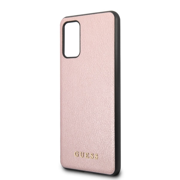 Guess Iridescent Leather Hard Case - дизайнерски кожен кейс за Samsung Galaxy S20 Plus (розово злато)