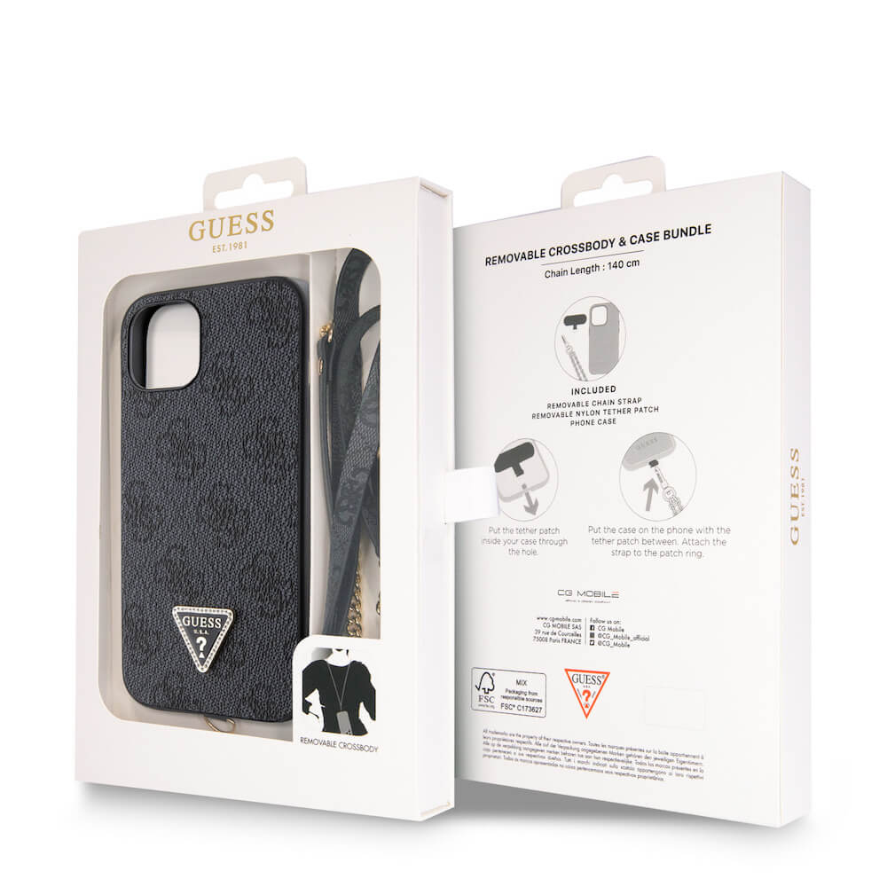 Guess PU 4G Strass Triangle Metal Logo Case With Crossbody Strap - силиконов (TPU) калъф с връзка за носене през врата за iPhone 15 (черен)
