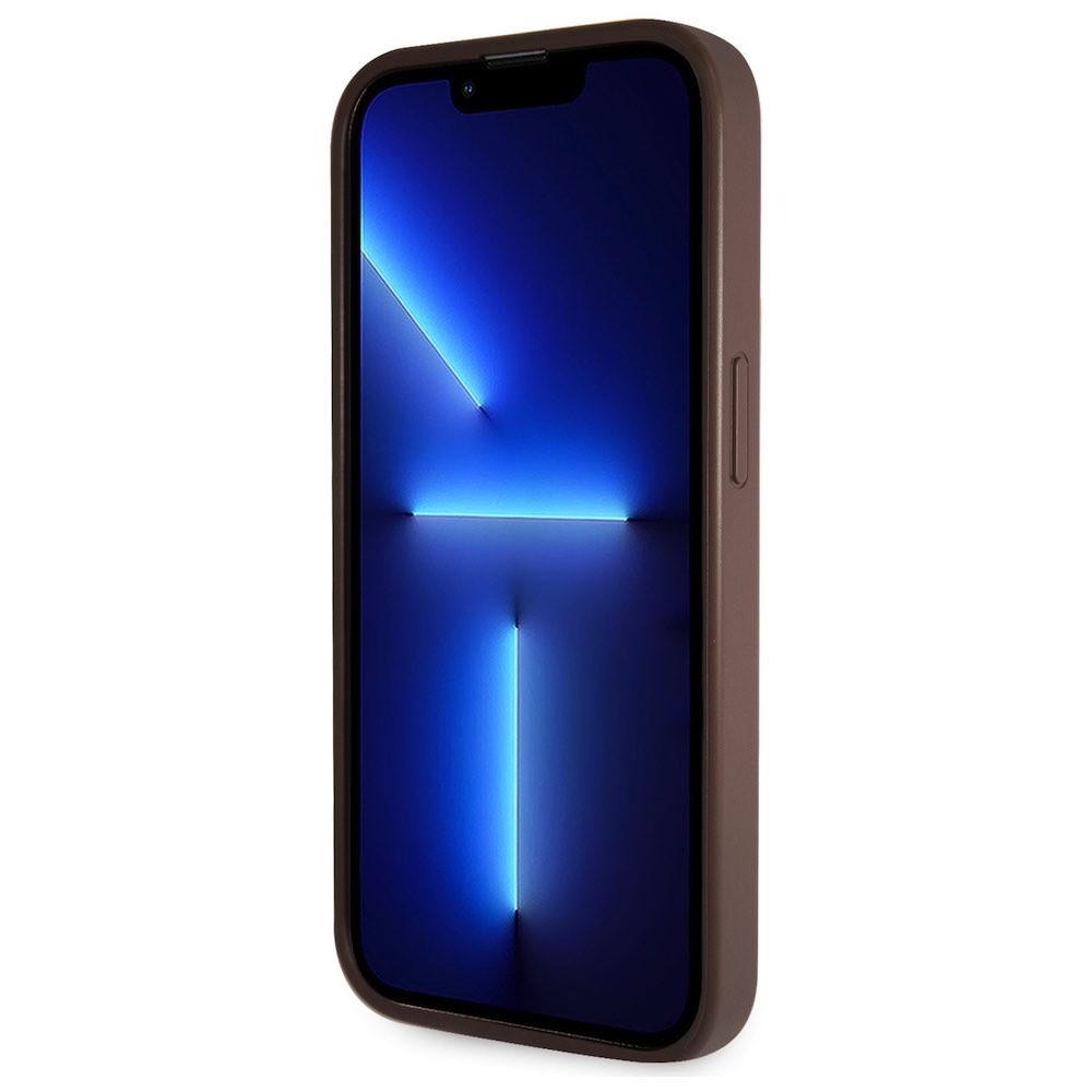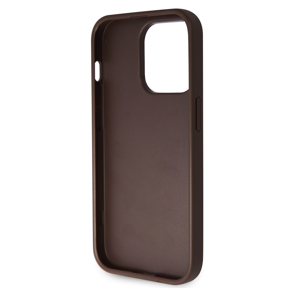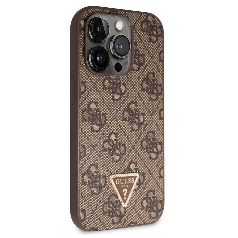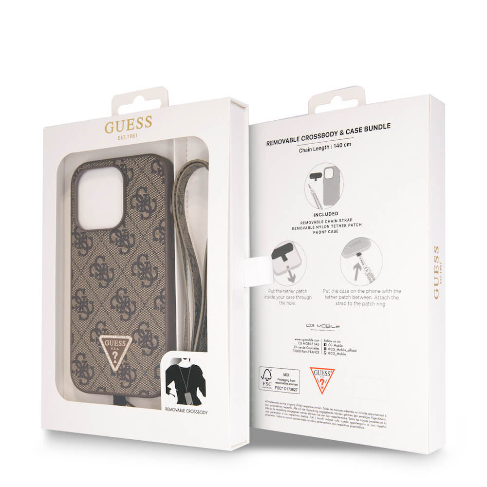 Guess PU 4G Strass Triangle Metal Logo Case With Crossbody Strap - силиконов (TPU) калъф с връзка за носене през врата за iPhone 15 Pro Max (кафяв)