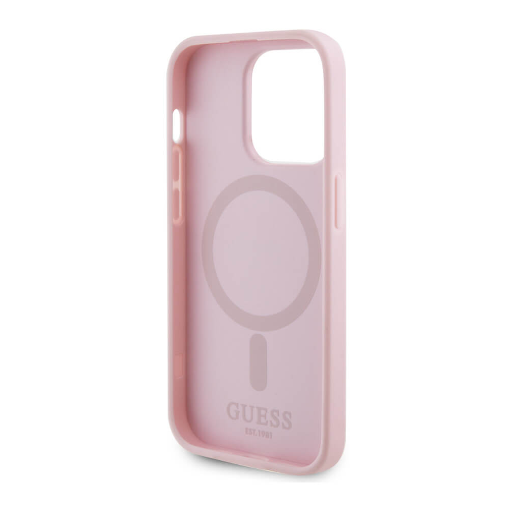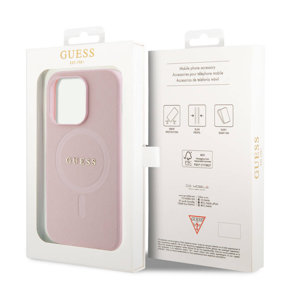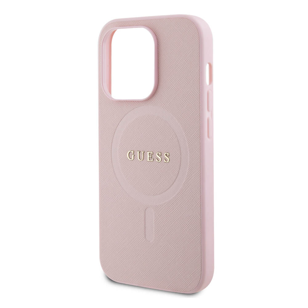 Guess PU Saffiano MagSafe Leather Hard Case - дизайнерски кожен кейс с MagSafe за iPhone 15 Pro Max (розов)
