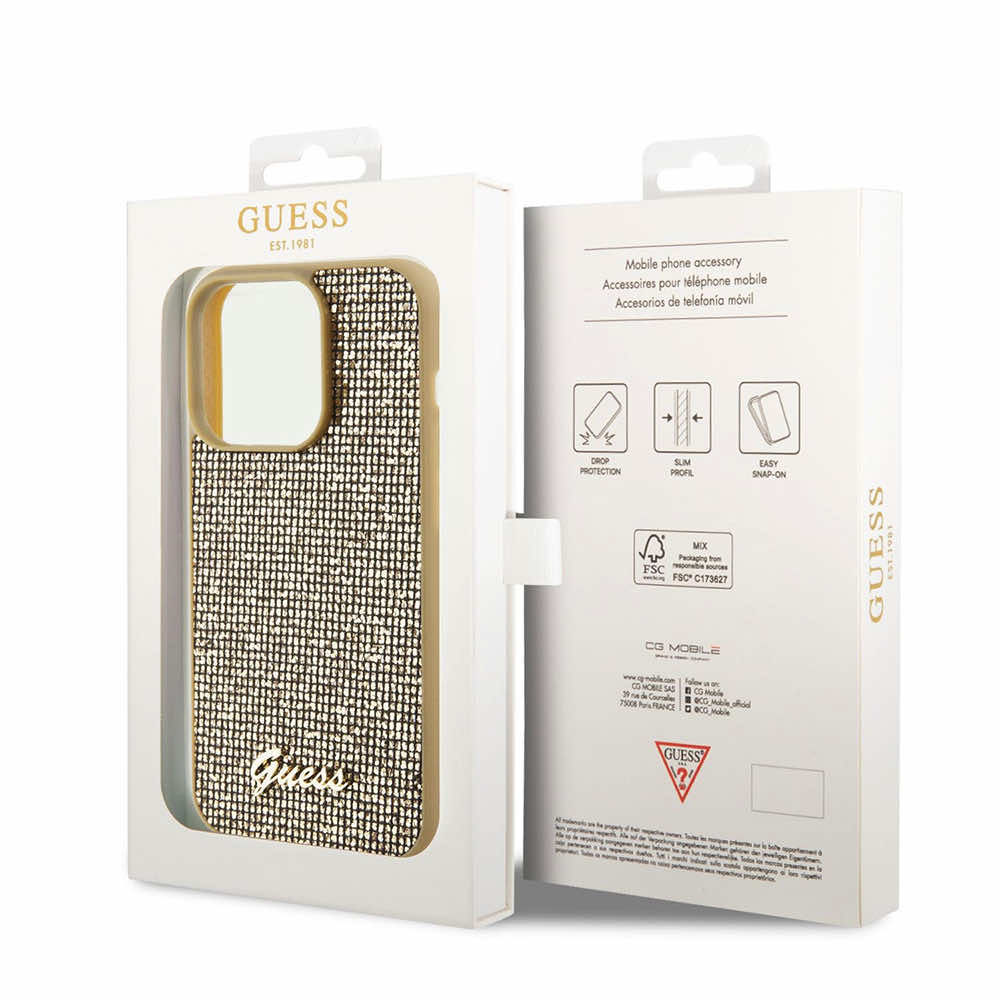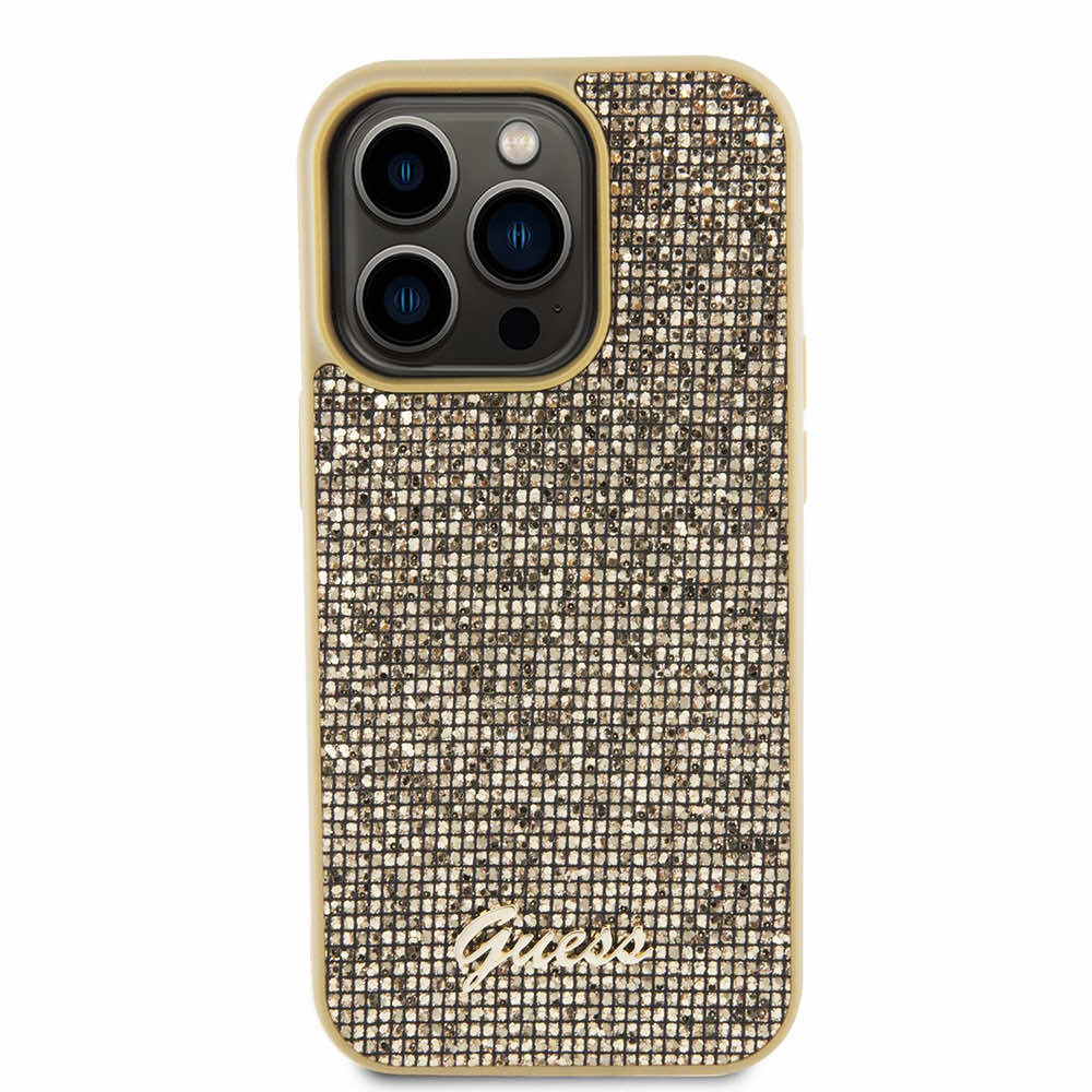 Guess PU Square Mirror Script Logo Leather Hard Case - дизайнерски кожен кейс за iPhone 15 Pro Max (златист)