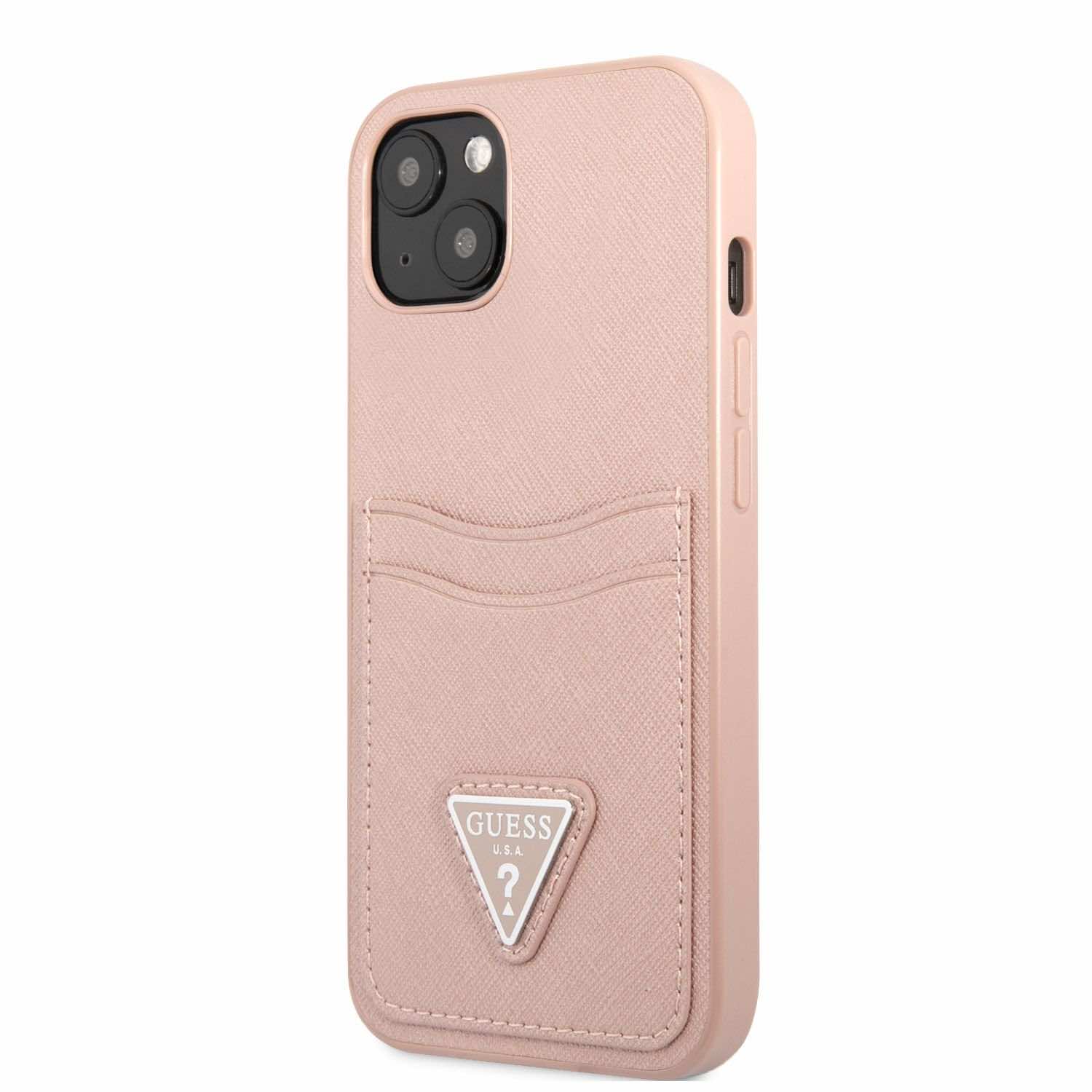 Guess Saffiano Double Card PU Leather Hard Case - дизайнерски кожен кейс с джоб за карти за iPhone 13 (розов)