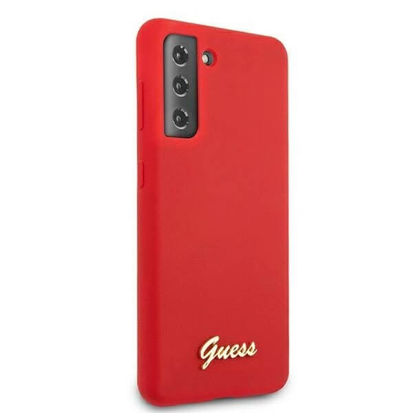 Guess Silicone Script Metal Logo Silicone Case - дизайнерски силиконов кейс за Samsung Galaxy S21 (червен)