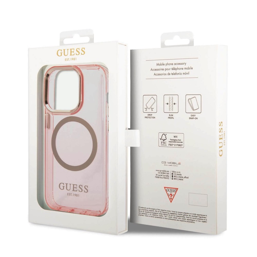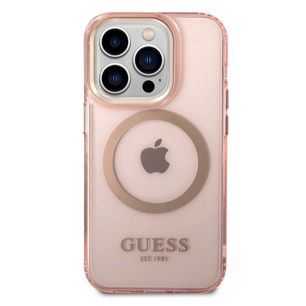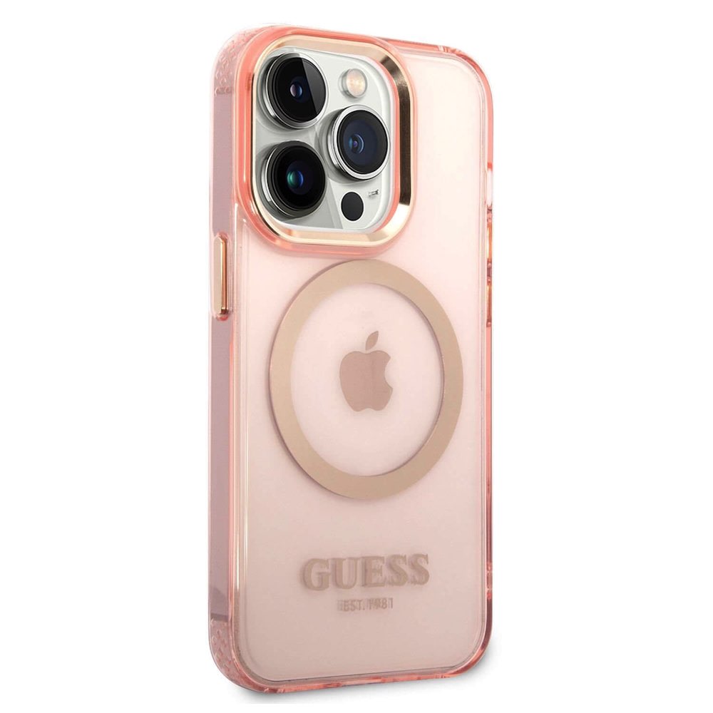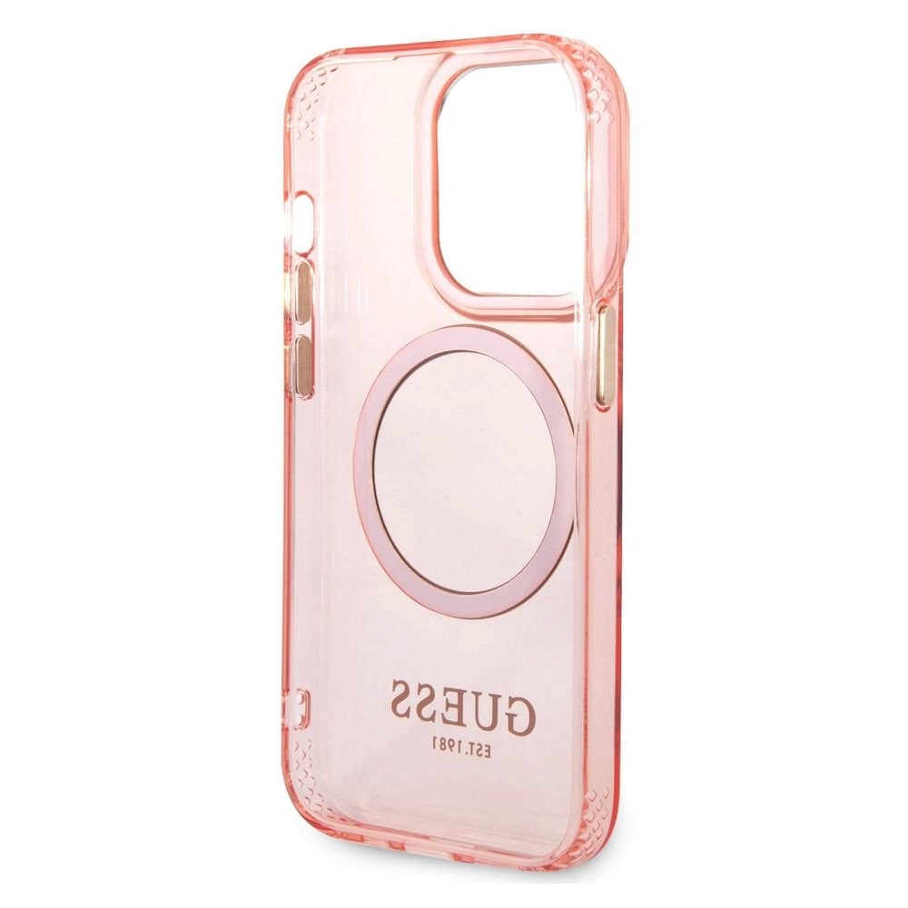 Guess Translucent MagSafe Case - хибриден удароустойчив кейс с MagSafe за iPhone 14 Pro Max (розов-прозрачен)